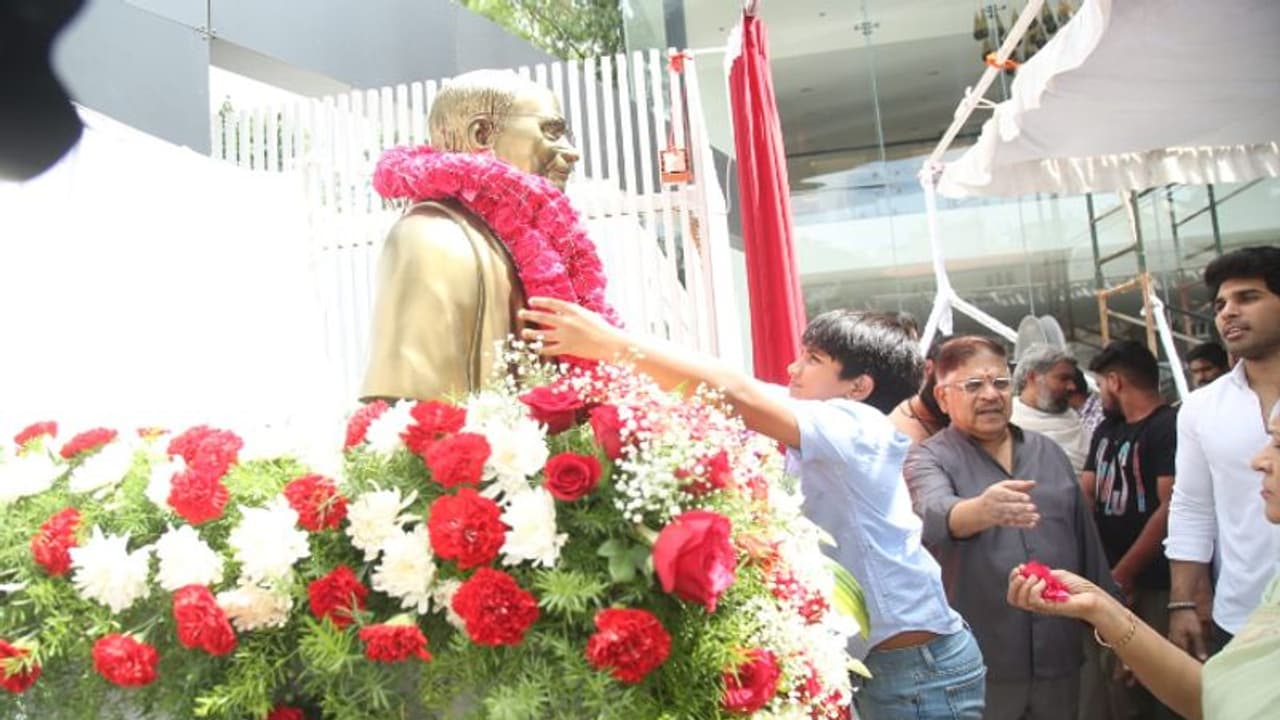 అల్లు రామలింగయ్య కాంస్య విగ్రహాన్ని ఆవిష్కరించారు అల్లు అర్జున్ తనయుడు అల్లు అయాన్. తన తండ్రి అల్లు రామలింగయ్య 101వ జయంతిని పురస్కరించుకుని ఈ విగ్రహావిష్కరణ కార్యక్రమం నిర్వహించారు నిర్మాత అల్లు అరవింద్. జూబ్లీహిల్స్ లోని అల్లు బిజినెస్ పార్క్ లో ఈ కాంస్య విగ్రహాన్ని ఆవిష్కరించడం విశేషం. అయితే మనవడి చేతుల మీదుగా ఈ విగ్రహాన్ని ఆవిష్కరించడం విశేషం. ఈ విగ్రహావిష్కరణ కార్యక్రమంలో నిర్మాత అల్లు అరవింద్, చిరంజీవి సతీమణి సురేఖ, హీరో అల్లు శిరీష్, అల్లు అర్జున్ కూతురు అర్హతోపాటు వారి ఇతర కుటుంబ సభ్యులు పాల్గొన్నారు. అల్లు రామలింగయ్య కాంస్య విగ్రహానికి పూల మాల వేసి ఆయన్ని గుర్తు చేసుకున్నారు.
