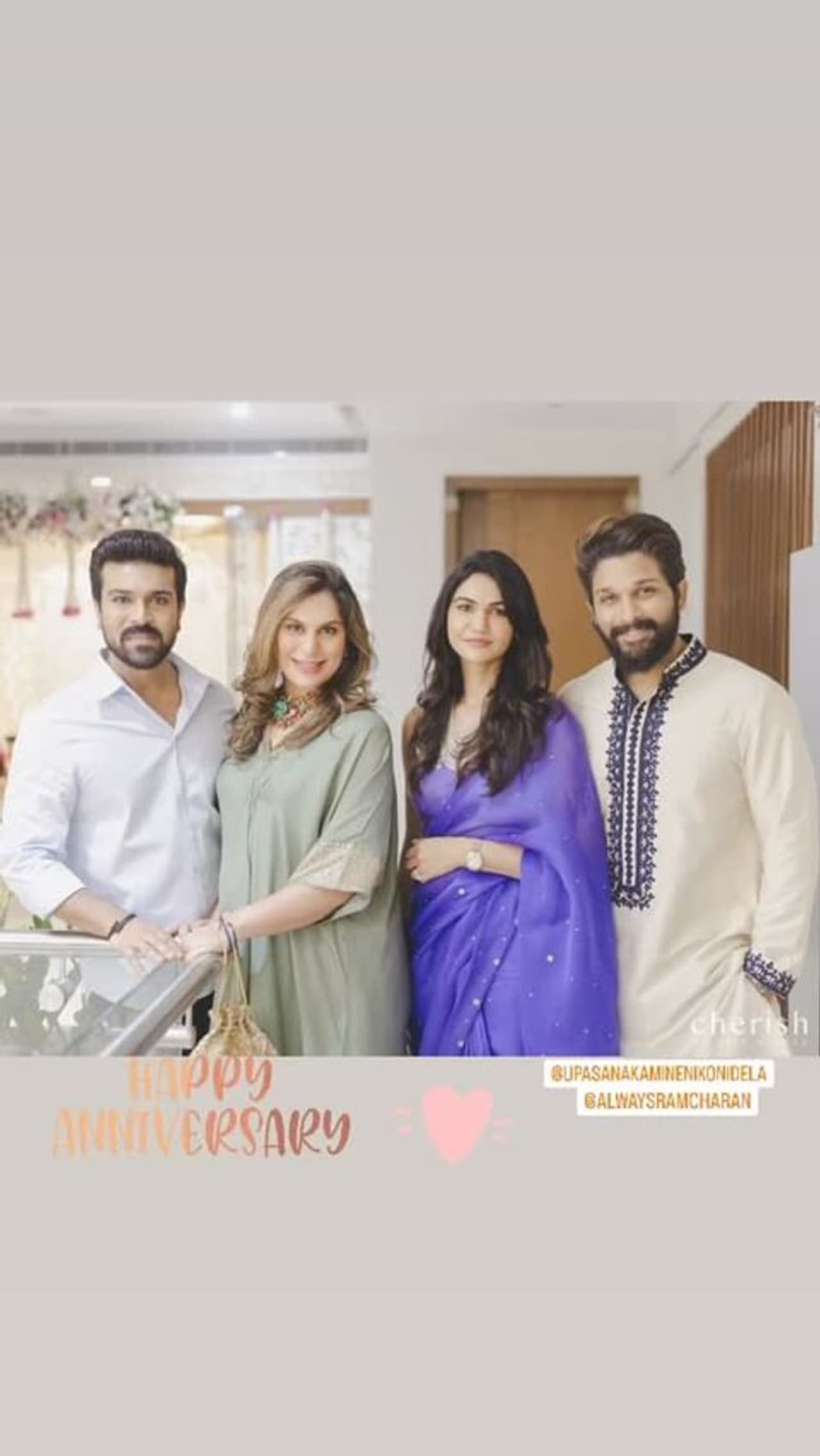 తాజాగా అల్లు స్నేహ సోషల్ మీడియాలో అదిరిపోయే పిక్ షేర్ చేసింది. నేడు రాంచరణ్, ఉపాసన దంపతుల 11వ వెడ్డింగ్ యానవర్సరీ. ఈ సందర్భంగా అల్లు స్నేహ బ్యూటిఫుల్ పిక్ షేర్ చేసింది.ఈ ఫోటో లో అల్లు అర్జున్, రాంచరణ్ సతీసమేతంగా కనిపిస్తున్నారు.