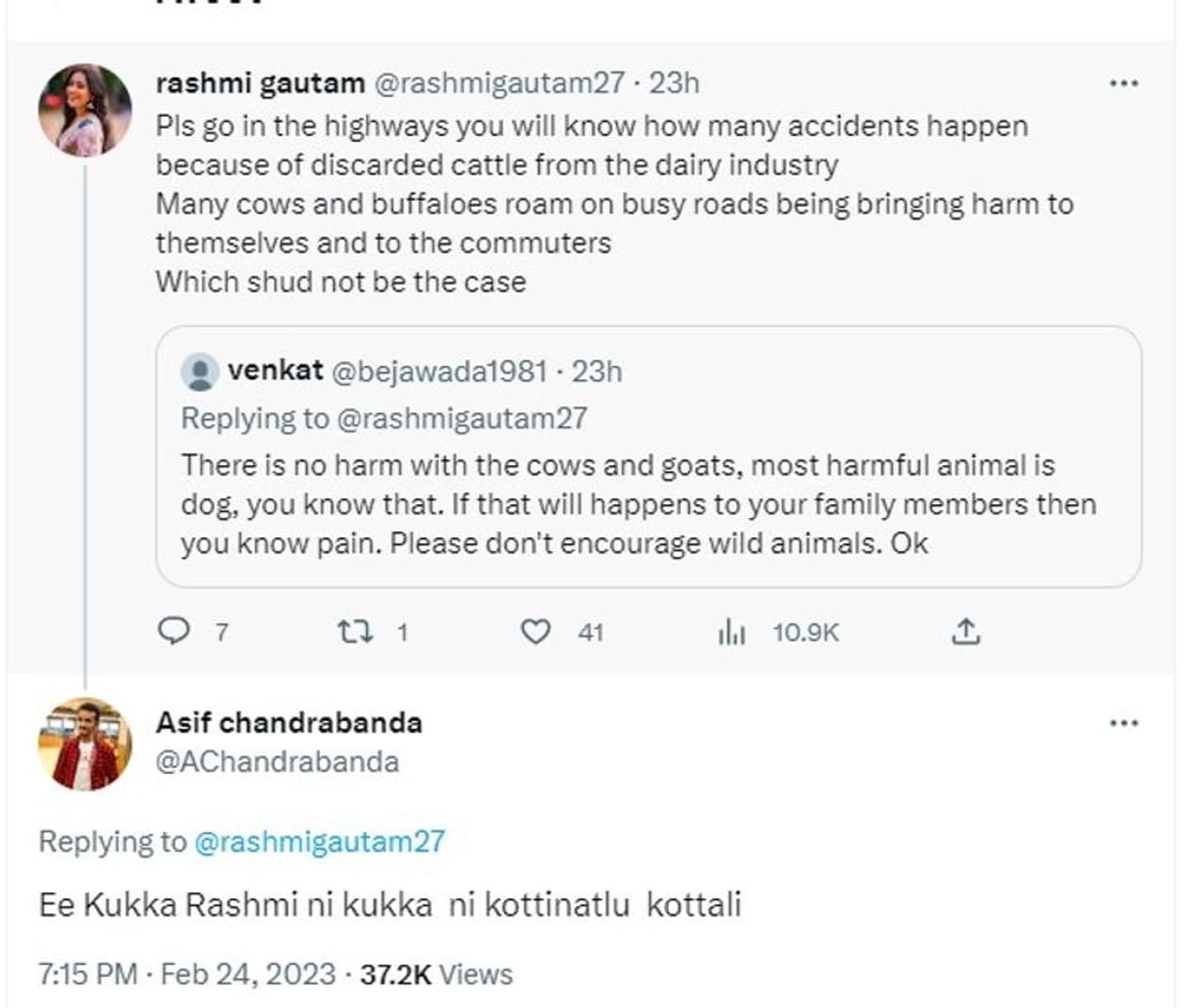 అవునా అయితే రోడ్ల పైకి వెళ్లి చూడు.. ఎక్కువ ప్రమాదాలు విచ్చలవిడిగా తిరుగుతున్న ఆవులు, గేదెల వెళ్లే జరుగుతున్నాయి. కానీ ఇది ఆ సందర్భం కాదు అని రష్మీ రిప్లై ఇచ్చింది. దీనితో మరో నెటిజన్ స్పందిస్తూ సంచలన వ్యాఖ్యలు చేశారు. ఈ రష్మీని కుక్కని కొట్టినట్లు కొట్టాలి అని కామెంట్ చేశాడు.