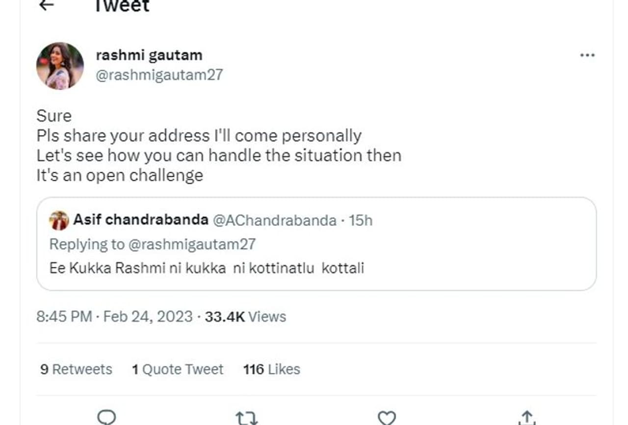 అతడి కామెంట్ కి రష్మీ అంతే ఘాటుగా దిమ్మతిరిగేలా రిప్లై ఇచ్చింది. తప్పకుండా.. నీ అడ్రెస్ చెప్పు.. నేనే పర్సనల్ గా వస్తాను. ఏం చేస్తావో చూస్తాను.. ఇది నా ఓపెన్ ఛాలెంజ్ అంటూ ఘాటుగా బదులిచ్చింది. అంబర్ పేటలో వీధి కుక్కల ఘటనపై జంతు ప్రేమికులు.. తల్లిదండ్రులే అప్రమత్తంగా, పిల్లలని జాగ్రత్తగా చూసుకోవాలి అని అంటున్నారు. దీనితో జంతుప్రేమికుల పట్లనెటిజన్లు తీవ్రంగా ఆగ్రహం వ్యక్తం చేస్తున్నారు.