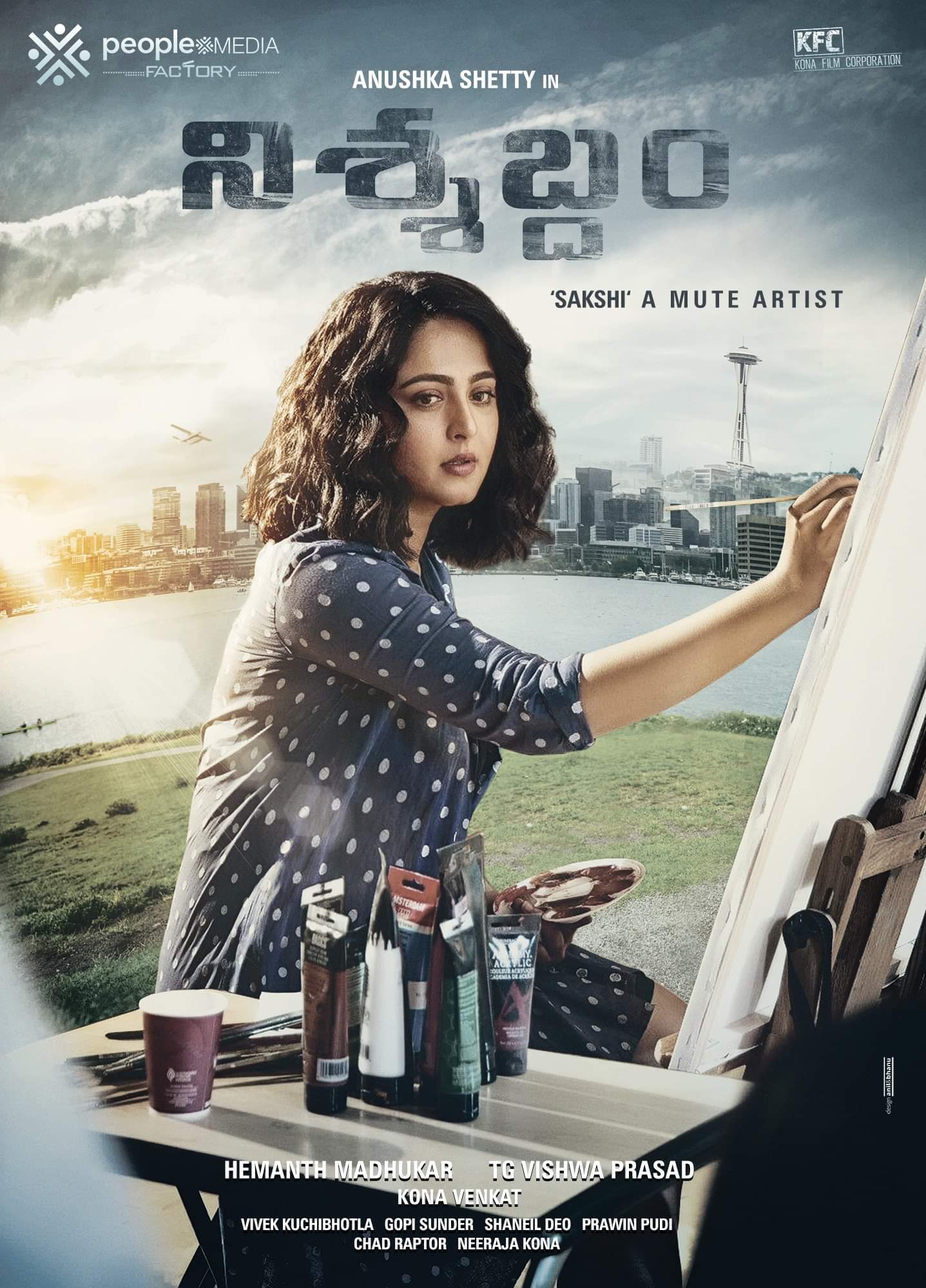 ఫైనల్ గా సినిమా ఫస్ట్ లుక్ ని చిత్ర యూనిట్ విడుదల చేసింది. పెయింట్ వేస్తూ అనుష్క చాలా క్యూట్ గా కనిపిస్తోంది. అలాగే అందులో ఒక హెవీ ఎమోషన్ ఉన్నట్లు అర్ధమవుతోంది. ఆర్ట్ బ్యాక్ డ్రాప్ లో అనుష్క తెరపై సరికొత్త థ్రిల్ ని కలిగించనుందని సమాచారం. అయితే పోస్టర్ లో అనుష్క పాత్ర 'సాక్షి మ్యూట్ ఆర్టిస్ట్' అనే లైన్ ఇవ్వడంతో అనుష్క పాత్రకు మూగ, చెవుడు అని అర్ధమవుతోంది. ఈ ప్రాజెక్ట్ లో మాధవన్ అలాగే హాలీవుడ్ యాక్టర్ మైకేల్ కూడా కీలక పాత్రల్లో కనిపించబోతున్నారు.
