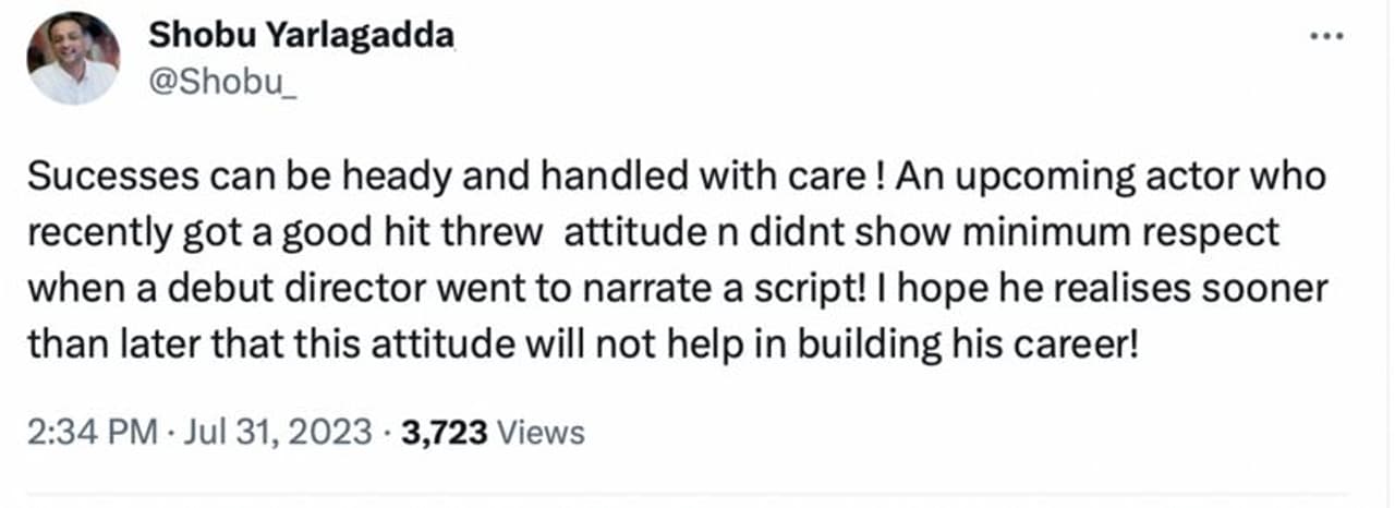 “సక్సెస్ ని తలకెక్కనివ్వకూడదు. దాన్ని చాలా జాగ్రత్తగా హ్యాండిల్ చేయాలి! ఇటీవలే మంచి హిట్ అందుకున్న ఒక కొత్త నటుడు .ఒక డెబ్యూ డైరెక్టర్ స్క్రిప్ట్ చెప్పడానికి వెళ్ళినప్పుడు కనీస గౌరవం చూపలేదు! ఈ వైఖరి అతని కెరీర్ను బిల్డ్ చేయటంలో సహాయపడదని అతను త్వరగానే గ్రహిస్తాడని నేను ఆశిస్తున్నాను! ”, అని శోభు ట్వీట్ చేసారంటూ ఈ పై ట్వీట్ వైరల్ అవుతోంది.