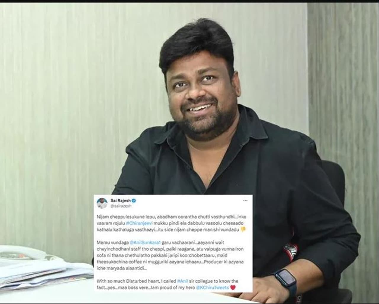 మేము మెగాస్టార్ చిరు గారి ఆఫీస్ లో ఉన్నప్పుడు అనిల్ సుంకరు గారు వస్తే ఆయన్ని వెయిట్ చేయించాడని తెలిసి పిలిచి పైకి రాగానే ఆయనే ఐరెన్ సోఫా జరిపి మరీ కూర్చోబెట్టారు. పని మనిషి తీసుకొచ్చిన కాఫీని ఆయన మా ముగ్గురికి అందించారు. నిర్మాతలకి ఆయనిచ్చే మర్యాద అలాంటిది. ఈ వార్తలని చూసి చాలా బాధతో నేను అనిల్ గారు దగ్గర పని చేసే ఒక వ్యక్తికి ఫోన్ చేసి అడిగి విషయం తెలుసుకున్నాను. మా బాస్ మీరనుకున్నట్లుగా కాదు. ఆయన వేరే. మా బాస్ చిరంజీవి గారిని చూసి నేను గర్వపడుతున్నాను అంటూ సాయి రాజేష్ చేసిన ట్వీట్ వైరల్ అయ్యింది.