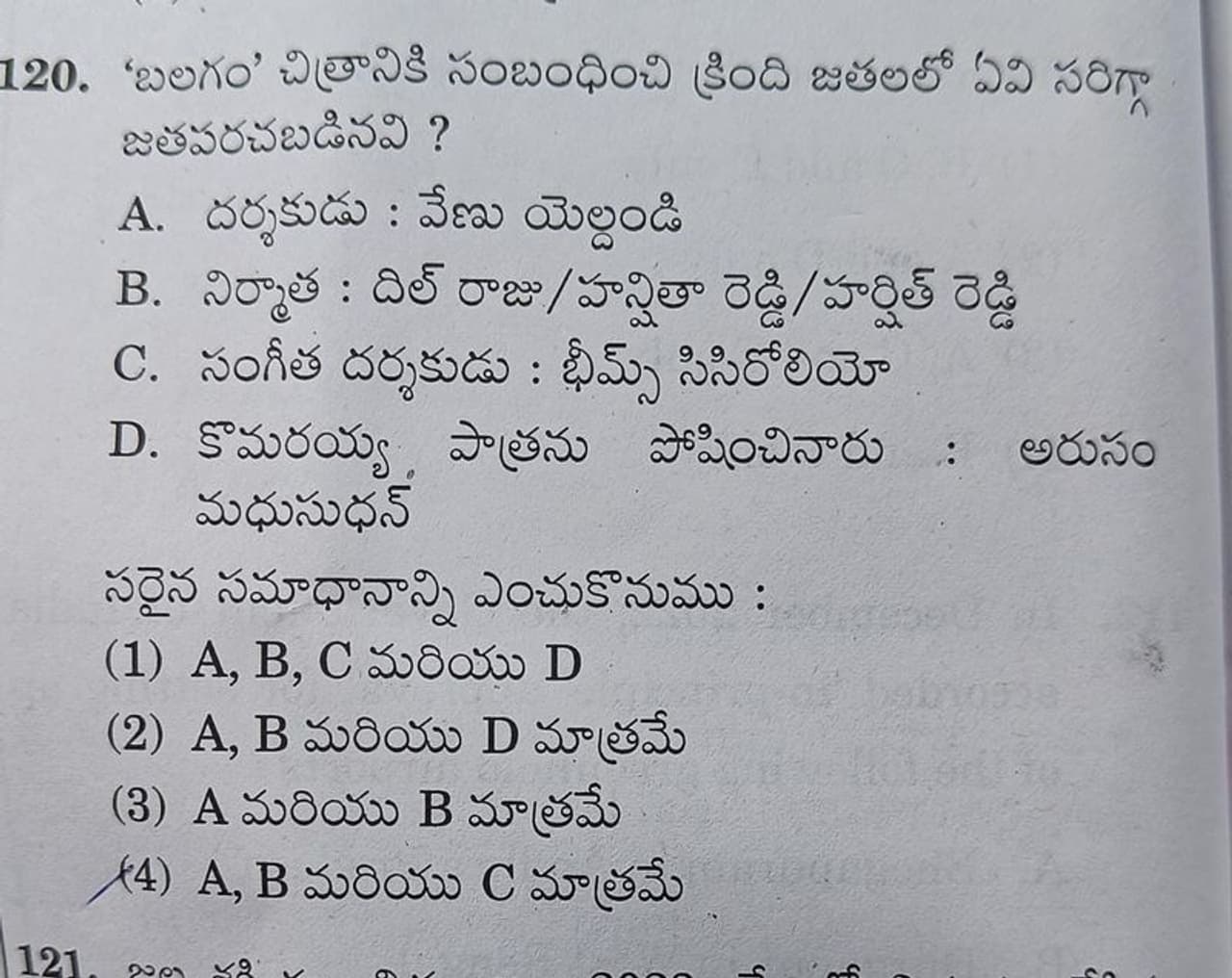 ఇంతకి ప్రశ్న ఏంటంటే.. ``బలగం` చిత్రానికి సంబంధించి క్రింది జతలలో ఏవీ సరిగ్గా జతపరచబడినవి?` అని అడిగారు. దీనికి నాలుగు ఆప్షన్లు ఇచ్చారు. ఏ- దర్శకుడు ః వేణు యెల్దండి, బి- నిర్మాతః దిల్రాజ్, హన్షితా రెడ్డి, హర్షిత్ రెడ్డి, సీ-సంగీత దర్శకుడుః భీమ్స్ సిసిరోలియో, డీ-కొమయ్య పాత్రని పోషించినవారుః అరుసం మధుసూధన్ అని ఆప్షన్లు ఇస్తూ కన్ ఫ్యూజ్ చేసేలా మరో ఆప్షన్లు ఇచ్చారు. నాలుగింటిలో ఎన్ని కరెక్ట్ అనేది ప్రశ్న. ఇందులో ఏ, బీ,సీ కరెక్ట్ ఇచ్చి, డీ తప్పు ఇచ్చాడు. మొత్తానికి అభ్యర్థులను చిన్న కన్ఫ్యూజ్ చేసే ప్రయత్నం చేశారు. ప్రస్తుతం ఇది నెట్టింట వైరల్ అవుతుంది.