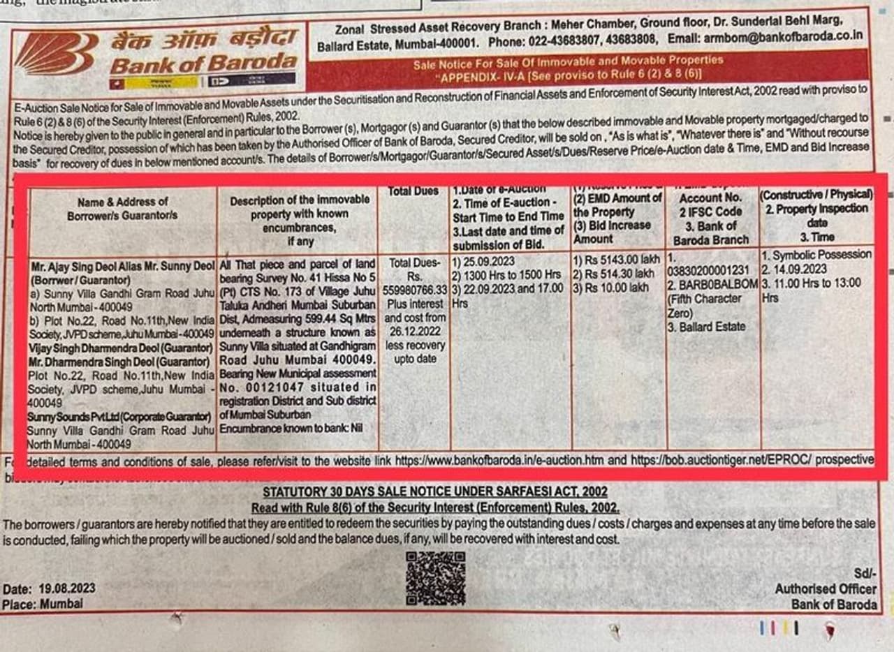 ముంబైలో గల మెగాపోలిస్లోని టోనీ జుహు ప్రాంతంలోని గాంధీగ్రామ్ రోడ్లో ఉన్న సన్నీ డియోల్ విల్లాను వేలం వేయనున్న బ్యాంక్ ప్రకటన విడుదల చేసింది. టెండర్లను ఆహ్వానించింది. ఈ మేరకు పత్రిక ప్రకటన ఇవ్వడంతో విషయం వెలుగులోకి వచ్చింది. ప్రటకనలో ఆ ఆస్తిని అటాచ్ చేసిన బ్యాంక్, వేలం కోసం రిజర్వ్ ధరను రూ. 51.43 కోట్లుగా నిర్ణయించింది. వేలానికి రూ. 5.14 కోట్లు డిపాజిట్గా వెల్లడించింది.