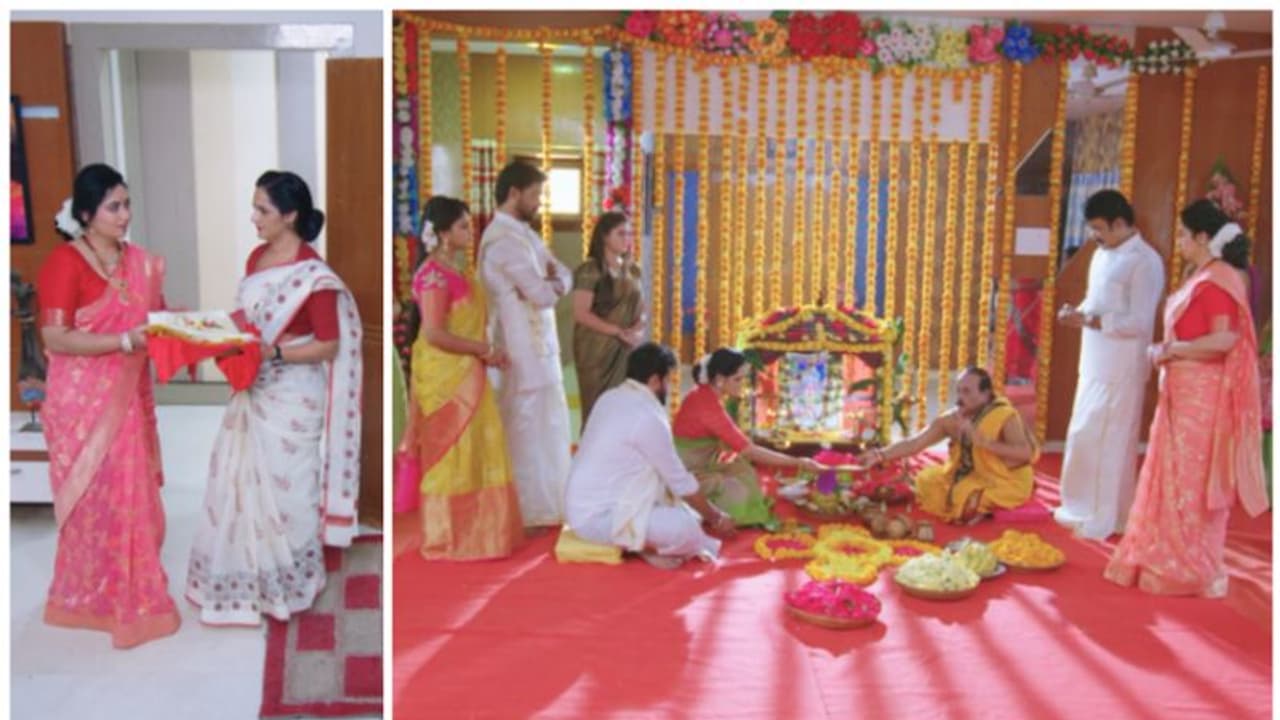 ఈరోజు ఎపిసోడ్లో దేవయాని జగతి ఒక గదిలోకి వెళ్ళగా ఏంటి జగతి నిన్న మొన్న వరకు ధైర్యంగా కనిపించావు ఈరోజు కాస్త టెన్షన్ పడుతున్నావు అనగా అదేం లేదు అక్కయ్య అని అంటుంది జగతి. ఇంతలోనే పళ్లెంలో చీర, పంచె తీసుకొని రావడంతో నాకెందుకు ఇస్తున్నారు అక్కయ్య అనగా ఇవి నీకు కాదు జగతి, వసు రిషి లకు ఇవ్వు అని అంటుంది. సత్యనారాయణ స్వామి వ్రతం జరుగుతోంది కదా కొత్త దంపతులైన రిషి,వసులకు ఈ బట్టలు ఇచ్చి వీటిని కట్టుకొని పూజలు కూర్చోమని చెప్పు అని అంటుంది. నీకంటే ఎలాగో ఈ ఆచారాలు సంప్రదాయాలు పెద్దగా పట్టించుకోవు కదా అందుకే నేను చూసుకుంటున్నాను ఈ వ్రత ఫలితం వాళ్లకు మాత్రమే కాకుండా మన కుటుంబం మొత్తానికి కలుగుతుంది అని అంటుంది.