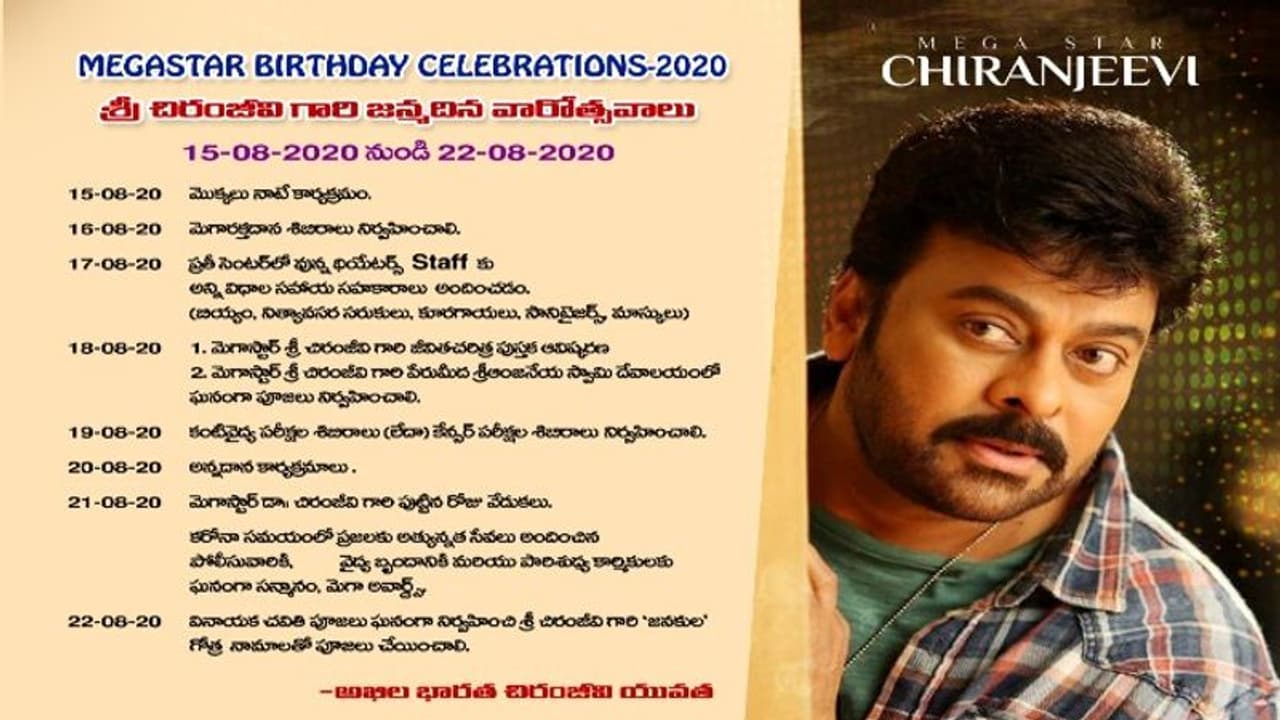 ఇందులో ఈ నెల 15 నుంచి 22 వరకు ఎనిమిది రోజుల పాటు చిరంజీవి జన్మదిన వారోత్సవాలు పేరుతో తాము చేపడుతున్న కార్యక్రమాలను ప్రకటించారు. మొదటి రోజు (15-8-2020) మొక్కలు నాటే కార్యక్రమం చేపట్టబోతున్నారు. రెండో రోజు(16-8-20) మెగా రక్తదాన శిబిరాలు నిర్వహించబోతున్నారు. మూడో రోజు (17-8-20) ప్రతీసెంటర్లో ఉన్న థియేటర్స్ స్టాఫ్కి అన్ని విధాల సహాయ సహకారాలు అందించనున్నారు. ఇందులో భాగంగా బియ్యం, నిత్యావసర సరుకులు, కూరగాయలు, శానిటైజర్స్, మాస్కులు అందించనున్నారు.