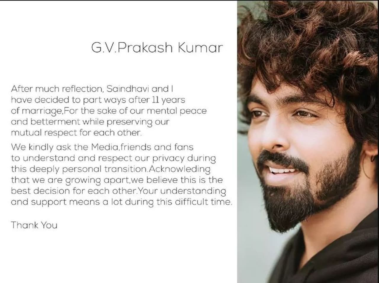 ‘‘చాలా ఆలోచించిన తర్వాత ‘సైంధవి, నేను 11 ఏళ్ల వైవాహిక బంధానికి వీడ్కోలు చెప్పాలని నిర్ణయించుకున్నాం. మానసిక ప్రశాంతత, ఇద్దరి జీవితాల్లో మెరుగుకోసం ఒకరికొకరం పరస్పర గౌరవంతో ఈ నిర్ణయం తీసుకున్నాం. ఇలాంటి కీలక తరుణంలో మా ప్రైవసీకు భంగం కలిగించకుండా ఉండేందుకు మీడియా, స్నేహితులు, అభిమానులు మా నిర్ణయాన్ని అర్థం చేసుకోవాలని కోరుకుంటున్నాం. ఇక నుంచి మేము వేరవుతున్నట్లు అంగీకరిస్తున్నాం. ఈ నిర్ణయం ఇద్దరికీ ఉత్తమమని నమ్ముతున్నాం. ఈ క్లిష్ట సమయంలో మీ అవగాహన, మద్దతు చాలా అవసరం’’ అని జీవీ ప్రకాశ్ పేర్కొన్నారు.