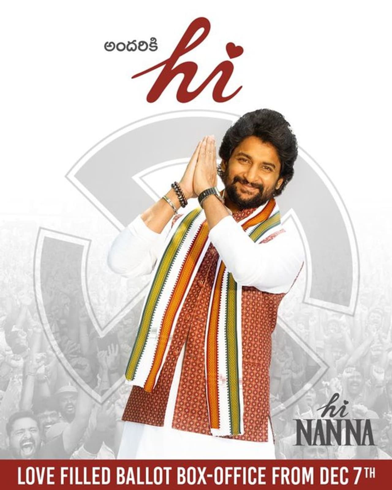 ఈ చిత్రం పాన్ ఇండియా స్థాయిలో ఐదు భాషల్లో గ్రాండ్ గా రిలీజ్ కాబోతోంది. ముందుగా ప్రకటించిన డేట్ కంటే పదిహేను రోజులు ముందుగానే డిసెంబర్ 7న విడుదల కానుంది. సినిమా రిలీజ్ కు ఇంకా ఇరవై రోజులుండటంతో ప్రమోషన్స్ లో జోరు పెంచారు. ఈ సందర్భంగా నాని వినూత్నంగా సినిమాను ప్రచారం చేస్తున్నారు. ‘హాయ్ నాన్న పార్టీ ప్రెసిడెంట్. డిసెంబర్ 7న మీ ప్రేమ మరియు ఓటు మాకే ఉండాలి‘ అంటూ ఆడియెన్స్ ను కోరుతున్నారు. ఈ సందర్భంగా విడుదల చేసిన పోస్టర్ నెట్టింట వైరల్ గా మారింది. రాజకీయ నాయకుడిగా నాని ఇచ్చిన స్టిల్ ఆకట్టుకుంటోంది. తన సినిమాపై ఫోకస్ పెంచేందుకు ఉపయోగపడుతోంది.