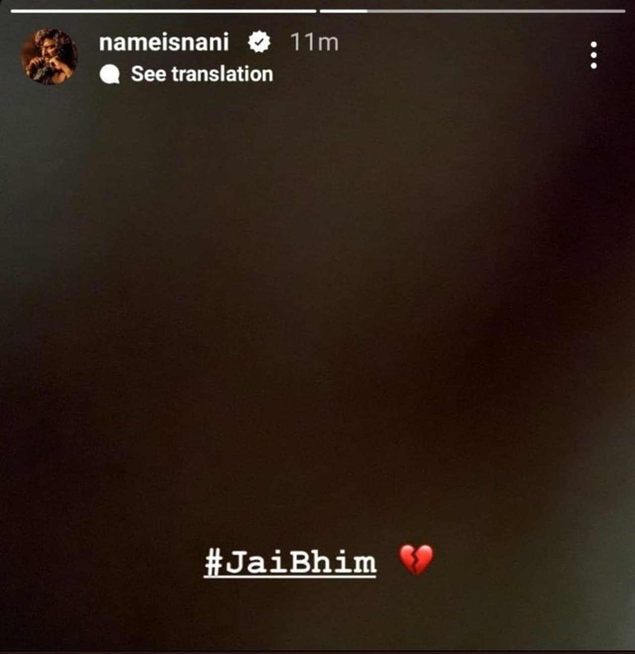 జై భీమ్ అణగారిన వర్గాలపై జరుగుతున్న పోలీస్ వ్యవస్థ దురాగతాలను ఎత్తి చూపుతూ వాస్తవ సంఘటనల స్ఫూర్తితో తెరకెక్కించారు. నేరుగా ప్రైమ్ లో విడుదలైన ఈ చిత్రం విమర్శకుల ప్రశంసలు అందుకుంది. సామాజిక అంశాలతో తెరకెక్కిన జై భీమ్ చిత్రానికి ఒక్క అవార్డు కూడా రాలేదు. దీంతో నాని జై భీమ్ అని రాసి పక్కనే బ్రేక్ అయిన హార్ట్ ఎమోజీ పోస్ట్ చేశాడు. ఒక మంచి చిత్రానికి అన్యాయం జరిగిందన్నట్లు ఆయన పరోక్షంగా వెల్లడించారు.