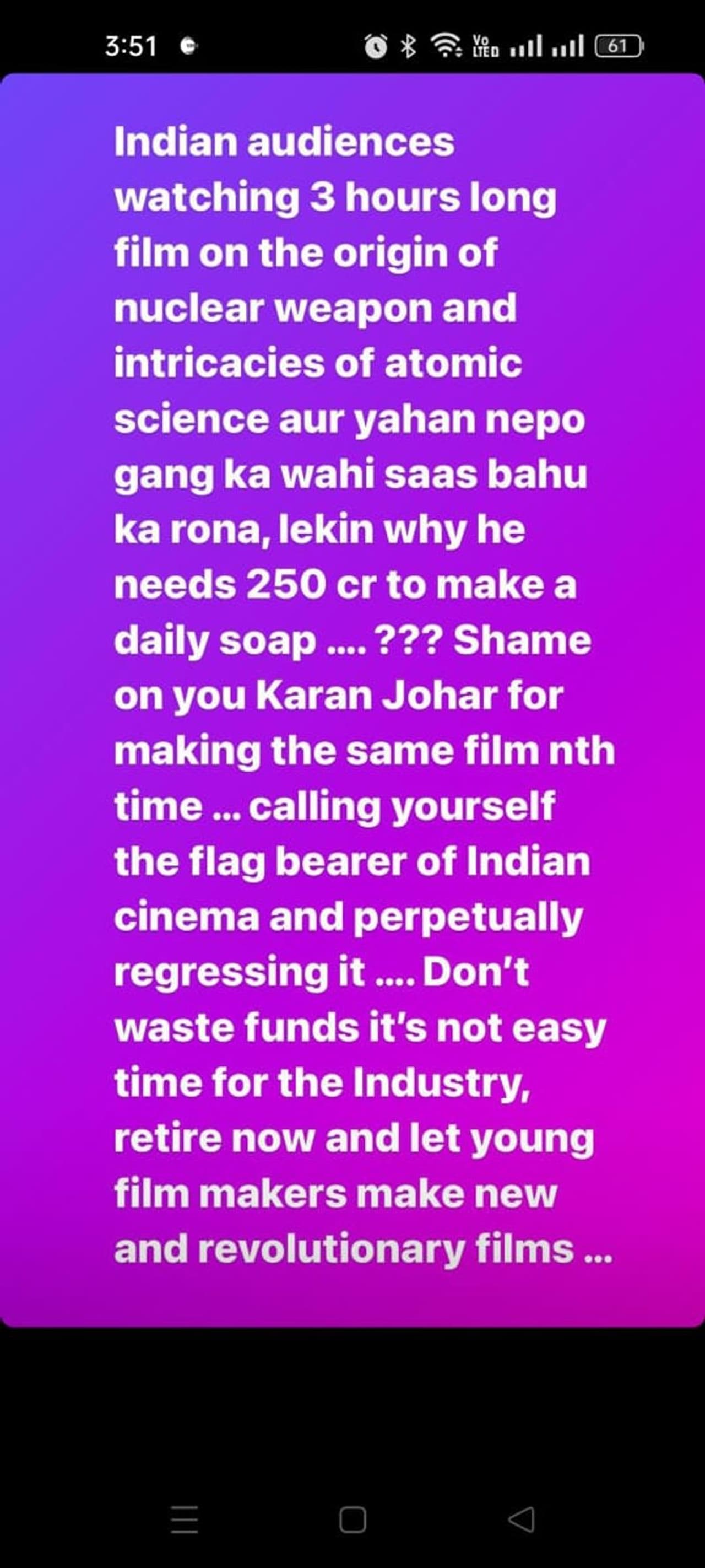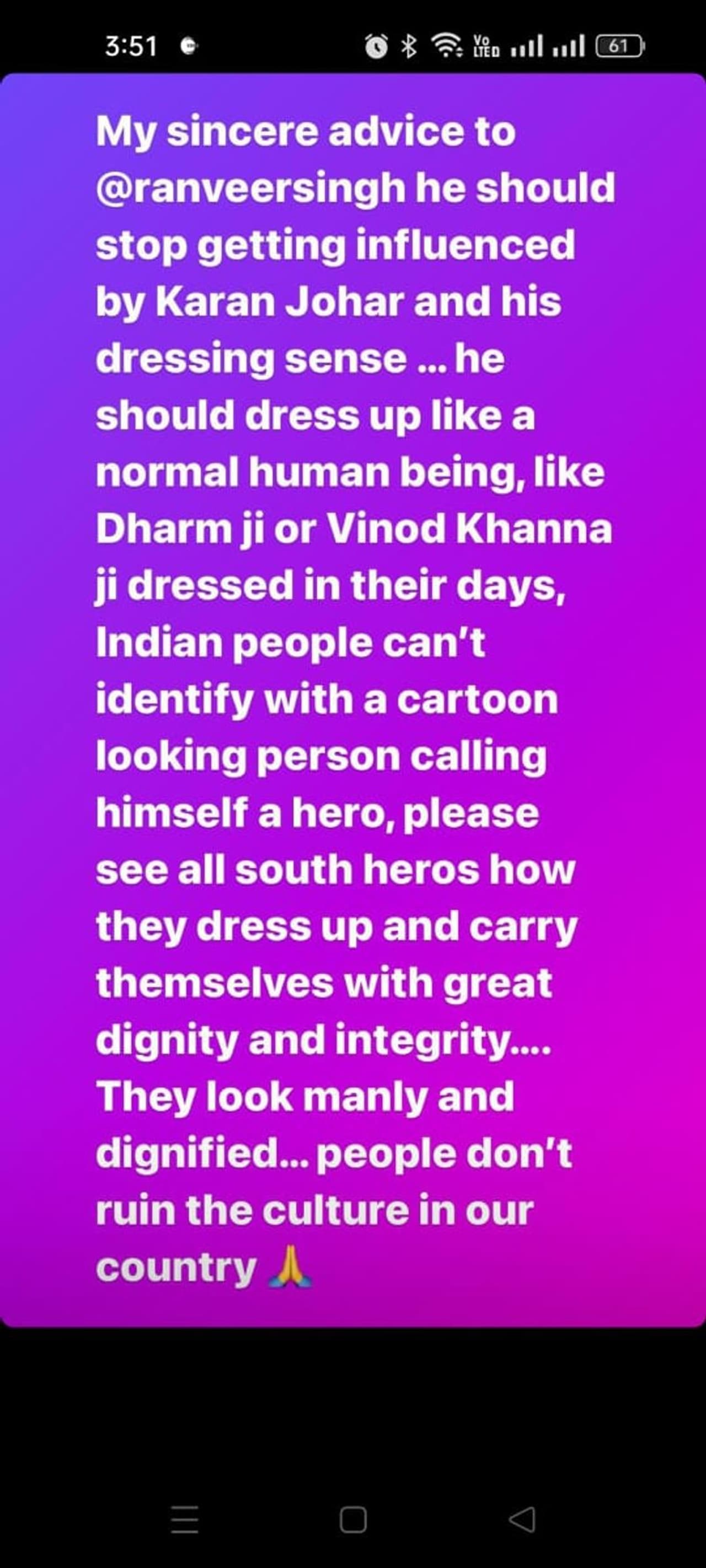 మూడు గంటల నిడివి ఉన్నా ఓపెన్ హైమర్ మూవీనే జనాలు చూస్తారు. నీ చెత్త సినిమా చూడరు. అత్తాకోడళ్ల డ్రామాకు వందల కోట్లు ఖర్చు చేయాల్సిన అవసరం లేదు. నువ్వేదో గొప్ప ఫిలిం మేకర్ అనుకుంటున్నావు. అదేం లేదు. నీ పని అయిపోయింది. డబ్బులు నాశనం చేసుకోకుండా రిటైర్ అయిపో. హీరో రణ్వీర్ సింగ్ కి నా సలహా ఏమిటంటే? కరణ్ జోహార్ ని ఫాలో అవ్వొద్దు. అతనిలా బట్టలు వేసుకోకు. ధర్మేంద్ర, వినోద్ ఖన్నా మాదిరి బట్టలు వేసుకో. లేదంటే మన సౌత్ హీరోలను చూసి నేర్చుకో. నీ వస్త్రధారణతో మన సంస్కృతి నాశనం చేయకంటూ.. ఆమె ఇంస్టాగ్రామ్ స్టోరీలో రాసుకొచ్చారు.