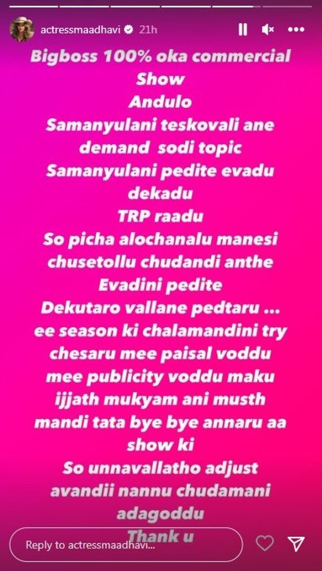 హీరోయిన్ మాధవీలత బిగ్ బాస్ షోకి వ్యతిరేకంగా కీలక వ్యాఖ్యలు చేశారు. ఆమె సోషల్ మీడియా పోస్ట్ వైరల్ అవుతుంది.