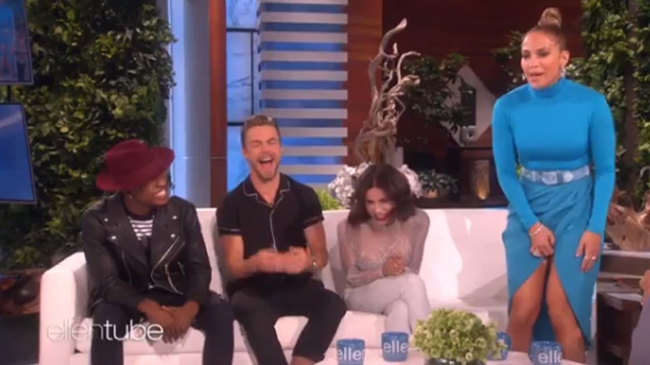 హాలీవుడ్ నటి, పాప్ స్టార్ జెన్నిఫర్ లోపెజ్కు సంబంధించిన ఓ వీడియో సోషల్ మీడియాలో వైరల్ అయింది. ప్రఖ్యాత ఎలెన్ డిజెనెరస్ టాక్ షోకు హాజరైన సందర్భంగా ఉత్సాహంగా ఓ డాన్స్ స్టెప్ వేయబోతే.... ఆమె వేసుకున్న డ్రెస్ ఇబ్బంది పెట్టింది. ఎలెన్ టాక్ షోకు 'వరల్డ్ ఆఫ్ డాన్స్' జడ్జిలు జెన్నా డేవన్, నే యో, డెరెక్ హాగ్లతో కలిసి హాజరయ్యారు. ఈ సందర్భంగా ఆమె ప్రత్యేకంగా డిజైన్ చేసిన బ్లూ కలర్ డ్రెస్సులో ఆకట్టుకున్నారు. కార్యక్రమం మధ్యలో ఆమె ఓ డాన్స్ స్టెప్ వేయడానికి ప్రయత్నించగా ప్రైవేట్ పార్ట్స్ బహిర్గతం అయ్యేలా ఆమె డ్రెస్ ఇబ్బంది పెట్టింది.