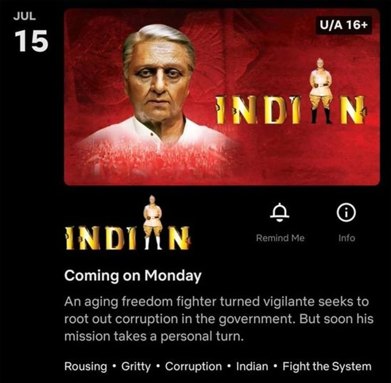 యూనివర్సల్ స్టార్ కమల్ హాసన్, స్టార్ డైరెక్టర్ శంకర్ కాంబినేషన్ లో భారతీయుడు సీక్వెల్ గా వచ్చిన భారతీయుడు-2 చిత్రం మొన్న (జులై 12) వరల్డ్ వైడ్ గా ప్రేక్షకుల ముందుకు వచ్చిన సంగతి తెలిసిందే. అన్ని చోట్ల నుంచి మిక్స్ డ్ టాక్ సంపాదించుకున్న ఈ మెసేజ్ ఓరియెంటెడ్ ఫిల్మ్ అనుకున్న స్దాయిలో లేదని విమర్శలు, ట్రోలింగ్ జరుగుతోంది. ఇదిలా ఉండగా నెట్ ప్లిక్స్ వారు సోమవారం నుంచి భారతీయుడు సినిమా స్ట్రీమింగ్ అవుతుందని ప్రకటన ఇచ్చారు. ఈ ప్రకటన ఇమేజ్ సోషల్ మీడియాలో వైరల్ అవుతోంది.