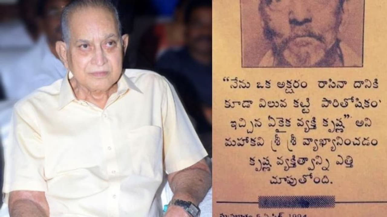 అంతేకాదే ఏకంగా శ్రీ శ్రీనే కృష్ణ గురించి ఈ విషయాలను తెలిపారట. `నేను ఒక అక్షరం రాసినా దానికి కూడా విలువ కట్టి పారితోషికం ఇచ్చిన ఏకైకా వ్యక్తి కృష్ణ. సినీ ఫీల్డ్ నా మీద ప్రత్యేకాభిమానం ఉన్న అనేకులలో ముఖ్యుడు కృష్ణ. ఆయన్ని ఆత్మీయుడిగా పరిగణిస్తాను` అని స్వయంగా శ్రీశ్రీనే పేర్కొనడం విశేషం. శ్రీశ్రీ తెలియజేసినట్టుగా ఓ సుప్రభాతం అనే పత్రిక 1994లో ఏప్రిల్ 5న ప్రచురించింది. ప్రస్తుతం ఆ పేపర్ క్లిప్ వైరల్ అవుతుంది.