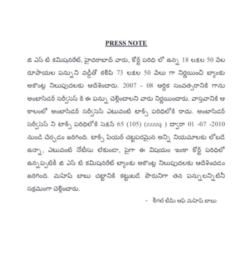 అంబాసిడర్ సేవలను పన్ను పరిధిలోకి సెక్షన్ 65 (105) (జెడ్ జెడ్ జెడ్ జెడ్ క్యూ) ద్వారా 2010 జులై 1వ తేదీ నుంచి చేర్చారని, పన్ను చెల్లింపుదారుడు చట్టపరమైన అన్ని నియమాలకు లోబడే ఉన్నా, ఎటువంటి నోటీసు లేకుండా, పైగా ఈ విషయం కోర్టు పరిధిలో ఉన్నప్పటికీ జీఎస్టీ కమిషనరేట్ బ్యాంకు ఖాతాల నిలుపుదలకు ఆదేశించిందని మహేష్ బాబు లీగల్ టీమ్ వివరించింది.
