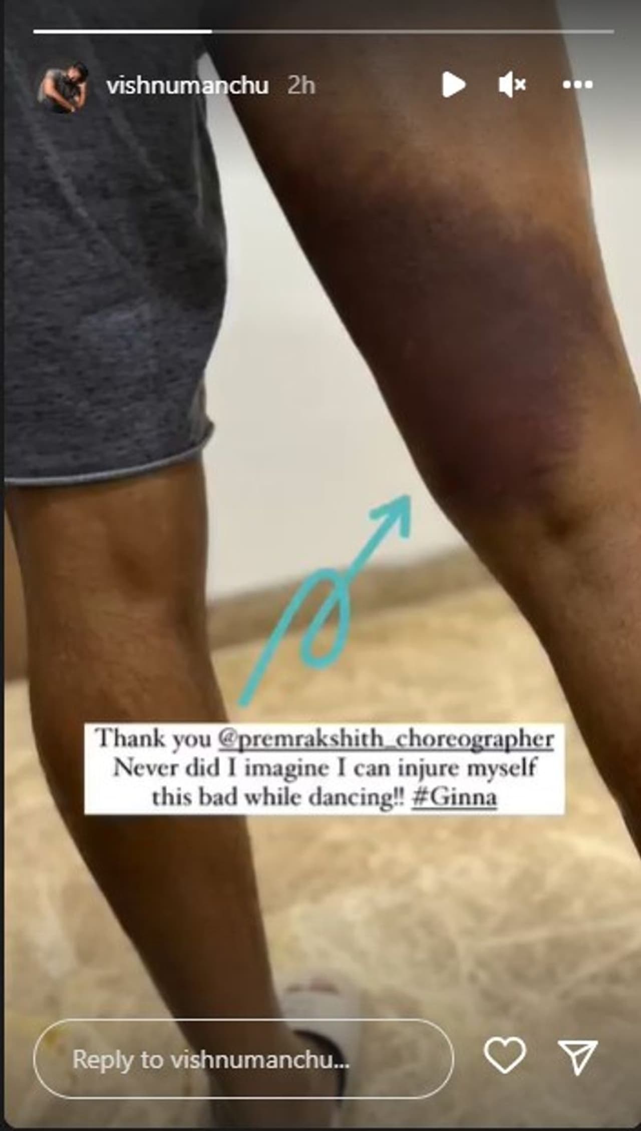 ప్రేమ్ రక్షిత్ మాస్టర్ కొరియోగ్రఫీలో సాంగ్ షూటింగ్ జరుగుతున్న టైంలో విష్ణు కాలికి గాయం అయింది. డ్యాన్స్ చేస్తున్న సమయంలో ఈ గాయం అయింది. విష్ణు మోకాలి పై భాగం బాగా కమిలిపోయి కనిపిస్తోంది. 'డ్యాన్స్ చేస్తున్నప్పుడు ఇలా గాయపడతానని ఎప్పుడూ అనుకోలేదు అంటూ విష్ణు పోస్ట్ చేశాడు.