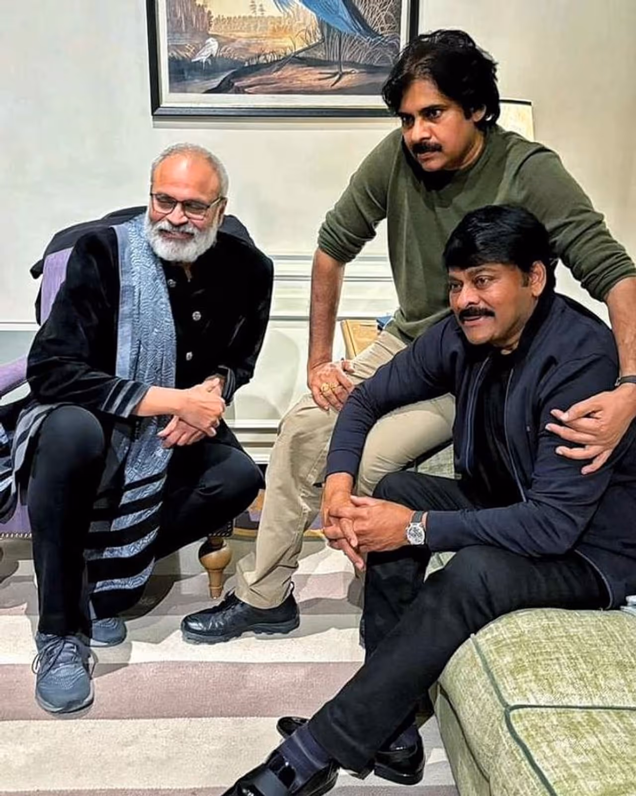 ఈ ఫొటోలో చిరు నాగబాబు సోఫాలో కూర్చుని ఉన్నారు. పక్కనే పవన్ కళ్యాణ్ చిరు బుజం పై చేసాయి వేసి ఇంటెన్స్ గా ఇస్తున్న ఫోజు అదిరిపోయింది. ముగ్గురు మెగా బ్రదర్స్ స్టైలిష్ లుక్స్ లో అదరగొడుతున్నారు. మరో పిక్ లో పవన్ కళ్యాణ్, రాంచరణ్ చిరునవ్వులతో నడుస్తూ వస్తున్నారు. ఈ పిక్ కి మెగా పవర్ ఫుల్ అంటూ ఫ్యాన్స్ కామెంట్స్ చేస్తున్నారు.