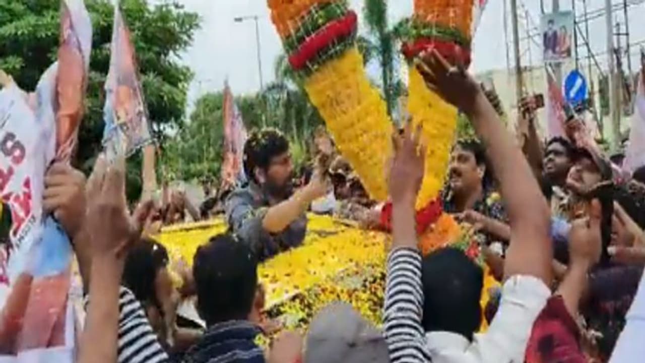 ప్రముఖ సినీ నటుడు చిరంజీవికి రాజమండ్రి ఎయిర్పోర్టు వద్ద అబిమానులు ఘన స్వాగతం పలికారు. అల్లూరి సీతారామరాజు 125వ జయంతి వేడుకల్లో పాల్గొనేందుకు చిరంజీవి భీమవరం వెళ్లనున్నారు. ఈ క్రమంలోనే ఈరోజు ఉదయం రాజమండి ఎయిర్పోర్ట్కు చేరుకున్న చిరంజీవికి స్వాగతం పలికేందుకు పెద్ద ఎత్తున మెగా అభిమానులు అక్కడికి తరలివచ్చారు. భారీ గజ మాలతో వెల్కమ్ చెప్పారు. ఈ క్రమంలోనే చిరంజీవి వారిని అభివాదం చేస్తూ అక్కడి నుంచి ముందుకు కదిలారు. చిరంజీవి అక్కడి నుంచి రోడ్డు మార్గంలో భీమవరం చేరుకుంటారు.