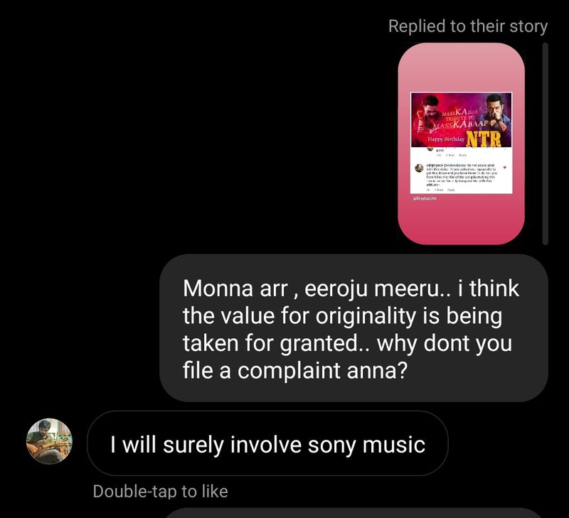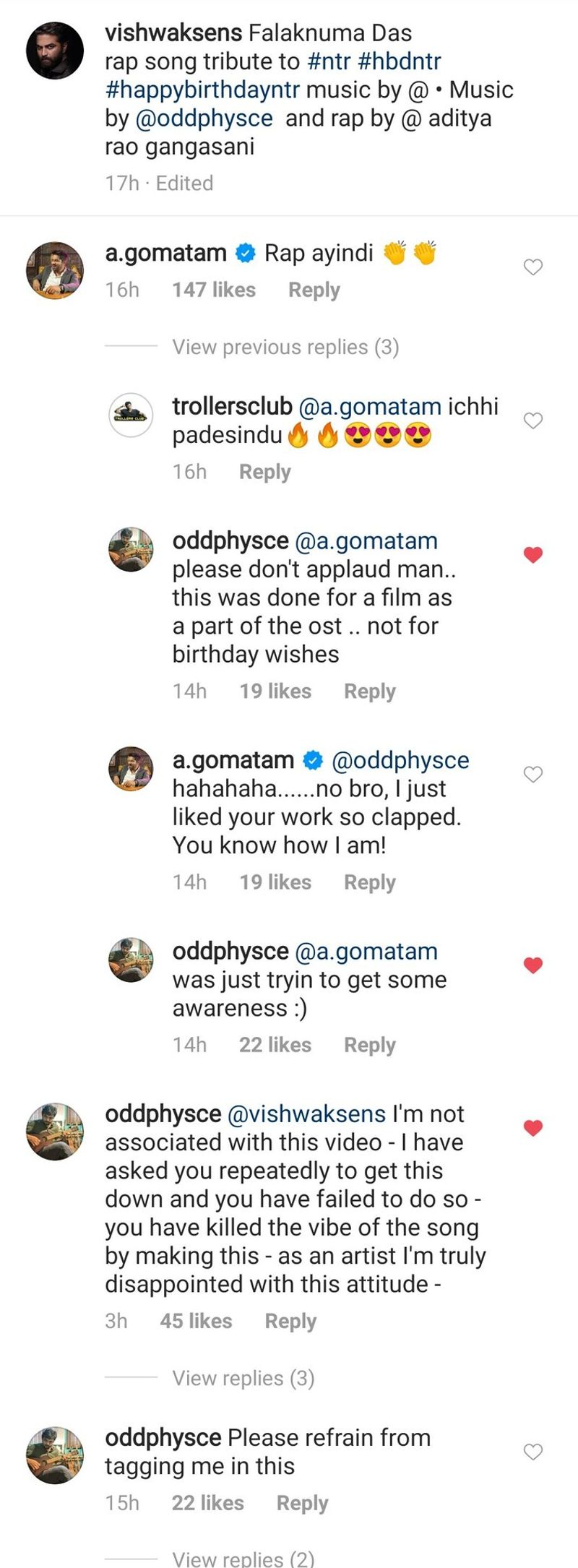 అంతేకాదు విశ్వక్ సేన్కు కూడా క్లారిటీ ఇచ్చే ప్రయత్నం చేశాడు. `నువ్వు రూపొందించిన వీడియోతో నాకు సంబంధం లేదు. నేను నా ట్రాక్ వినియోగించవద్దని చాలా సార్లు చెప్పే ప్రయత్నం చేశాను. కానీ నువ్వు చెప్పినట్టు వినలేదు. నువ్వు ఆ పాటలోని వైబ్ను చంపేశావు. నీ యాటిట్యూడ్తో నేను పూర్తిగా నిరాశ చెందాను` అంటూ కామెంట్ చేశాడు. అంతేకాదు నీ పోస్ట్లలో నన్ను ట్యాగ్ చేయవద్దు అంటూ కామెంట్ చేశాడు. అయితే అభిమానులు ఈ విషయంలో ఫైర్ అవుతున్నారు ఇలాంటి టాలెంట్ను కాపీ చేసే వారిపై తగిన చర్యలు తీసుకోవాలని కోరుతున్నారు.