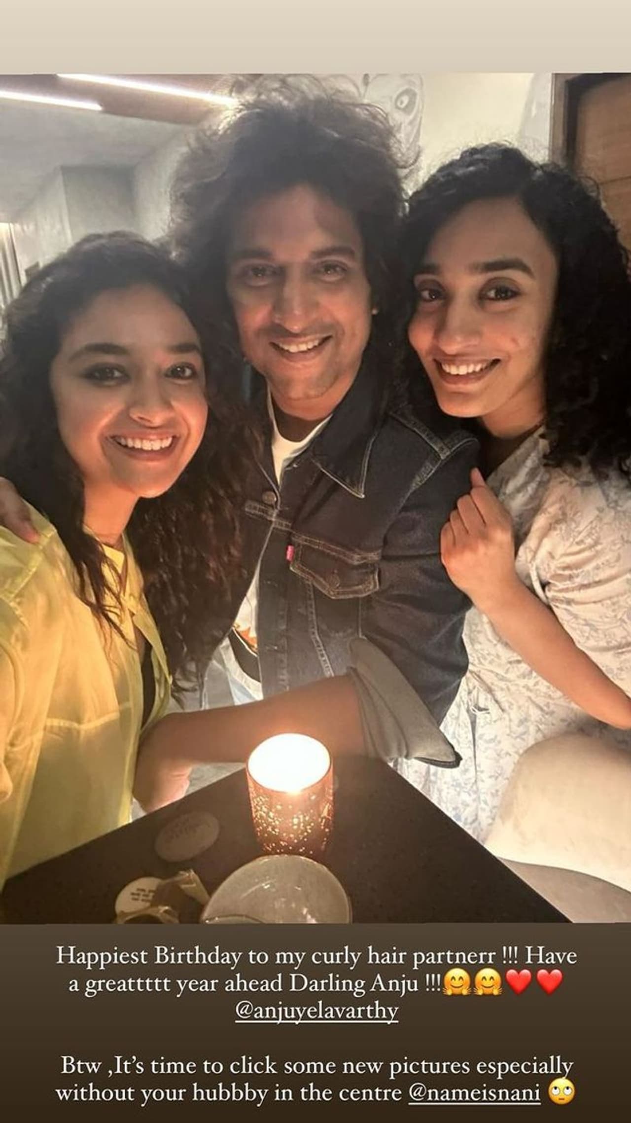 నాని, అంజనాతో కలసి నైట్ పార్టీలో ఉన్న దృశ్యాన్ని కీర్తి సురేష్ సోషల్ మీడియాలో పంచుకుంది. 'నా కర్లీ హెయిర్ పార్ట్నర్ అంజుకి హ్యాపీ బర్త్ డే. నీకు అంతా మంచే జరగాలని కోరుకుంటున్నా. నీ భర్త నాని లేకుండా మనం కొన్ని ఫొటోస్ తీసుకునే ప్రయత్నం చేద్దాం అంటూ ఫన్నీ పోస్ట్ చేసింది. ఈ పిక్ లో ఇద్దరి మధ్యలో నాని ఉన్నాడు. అలాగే అంటే సుందరానికీ హీరోయిన్ నజ్రియా కూడా అంజనాని విష్ చేస్తూ పోస్ట్ చేసింది.