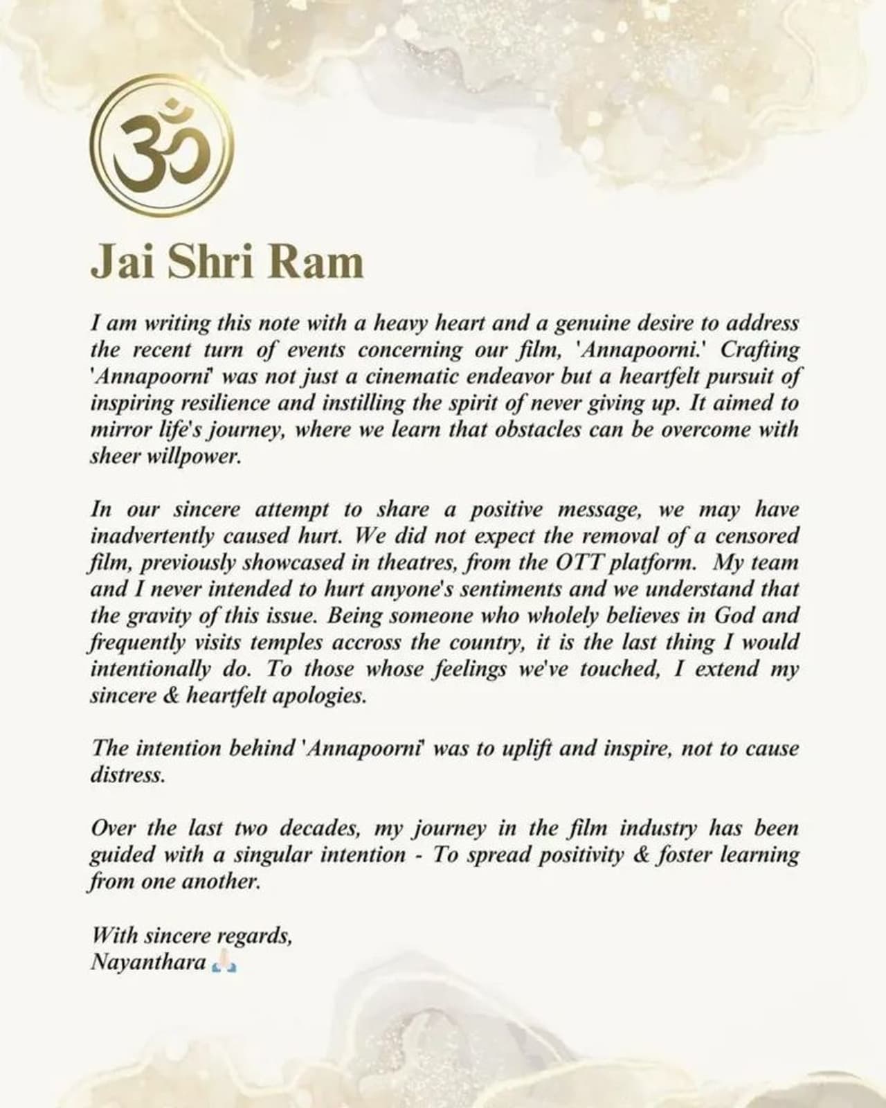 నయనతార తన చిత్రం ‘అన్నపూర్ణి’ చుట్టూ ఉన్న వివాదంపై పశ్చాత్తాపం వ్యక్తం చేసింది, ఎవరి భావోద్వేగాలను దెబ్బతీసే ఉద్దేశ్యం తనకు మరియు తన టీమ్ కి లేదని పేర్కొంది. అన్నపూర్ణి ఆందోళనలను ఉద్దేశించి నయనతార క్షమాపణ లేఖ రాసింది. నయనతార తన ఇన్స్టాగ్రామ్ పోస్ట్ ద్వారా ‘జై శ్రీరామ్’, హిందూ మత చిహ్నం ‘ఓం’ అని రాసి క్షమాపణలు చెప్పింది. నయనతార తన పోస్ట్లో, “ మేము పాజిటివ్ మెసేజ్ ని అందిచటానికి చేసిన మా హృదయపూర్వక ప్రయత్నంలో, మేము అనుకోకుండా మీకు బాధ కలిగించి ఉండవచ్చు. OTT ప్లాట్ఫారమ్ నుండి గతంలో థియేటర్లలో ప్రదర్శించబడి సెన్సార్ చేయబడిన సినిమా తీసివేయబడుతుందని మేము ఊహించలేదు. నా టీమ్,మేము ఎవరి మనోభావాలను దెబ్బతీయాలని ఎప్పుడూ అనుకోలేదు . ఈ సమస్య యొక్క తీవ్రతను మేము అర్థం చేసుకున్నాము. భగవంతుడిని పూర్తిగా నమ్మే వ్యక్తిగా మరియు దేశంలోని దేవాలయాలను తరచుగా సందర్శిస్తున్న నేను మరోసారి ఇలాంటి పొరపాటు జరగనివ్వను. ఈ సినిమా ద్వారా మనస్సులు గాయపడ్డవారికి నా హృదయపూర్వక క్షమాపణలు తెలియజేస్తున్నాను అంటూ ఆమె లెటర్ రాసారు.