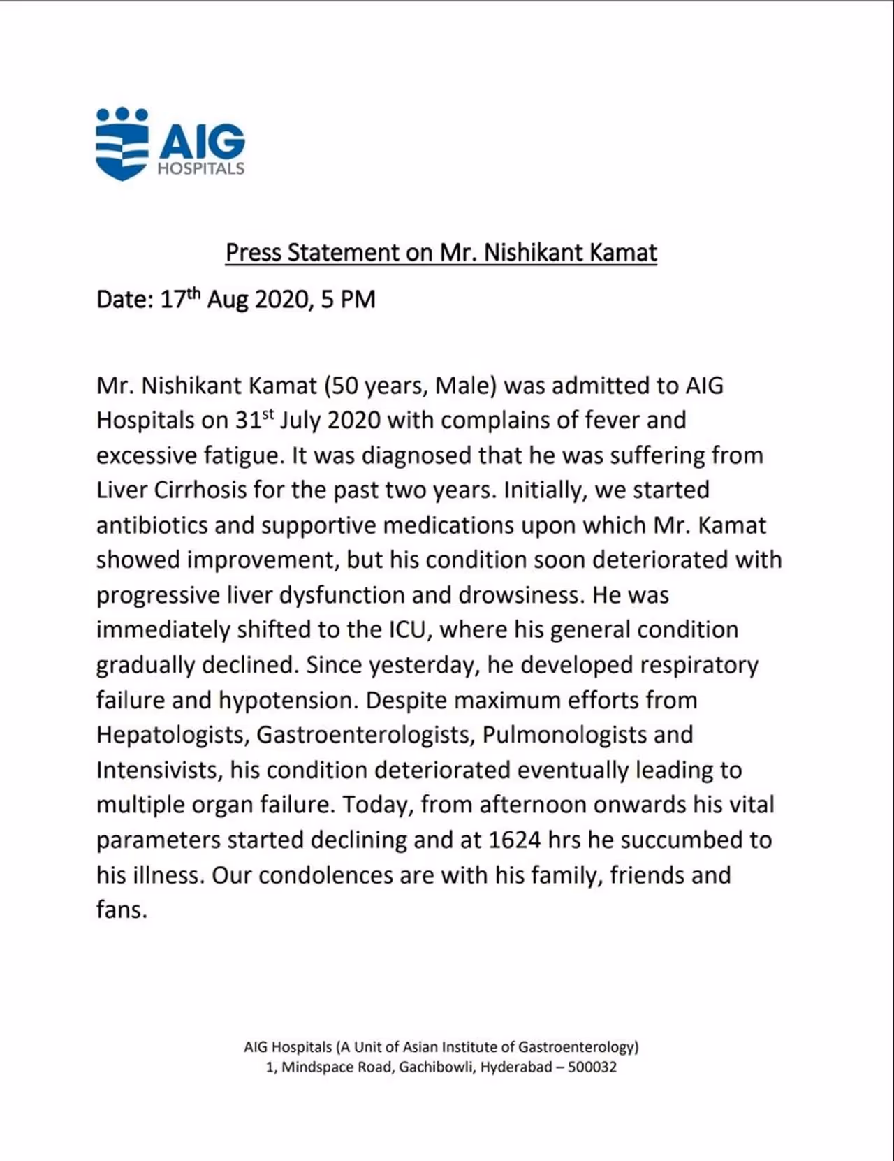 దర్శకుడు నిశికాంత్ కామత్ ఈ నెల 11న తీవ్ర అనారోగ్యంతో హైదరాబాద్లోని ఓ హాస్పిటల్లో చేరిన సంగతి తెలిసిందే. ఆయన అనారోగ్యం తీవ్రం కావటంతో సోమవారం తుదిశ్వాస విడిచారు. ఆయన మృతికి లివర్ సిరోసిస్ కారణమని ఆసుపత్రి వర్గాలు వెల్లడించాయి.