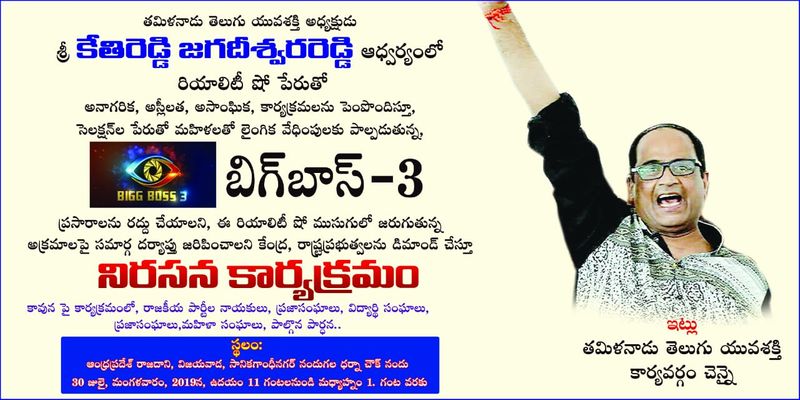 బిగ్ బాస్ షోని రద్దు చేయాలని డిమాండ్ చేస్తున్నారు. దీని కోసం జులై 30న తమిళనాడు తెలుగు యువశక్తి ఆధ్వర్యంలో విజయవాడలో నిరసన కార్యక్రమం జరగబోతున్నట్లు కేతిరెడ్డి ప్రకటించారు. ఈ నిరసన కార్యక్రమంలో ప్రజలతో పాటు రాజకీయ నాయకులు, విద్యార్థి సంఘాలు, ప్రజా సంఘాలు పాల్గొనాలని కేతిరెడ్డి పిలుపునిచ్చారు.