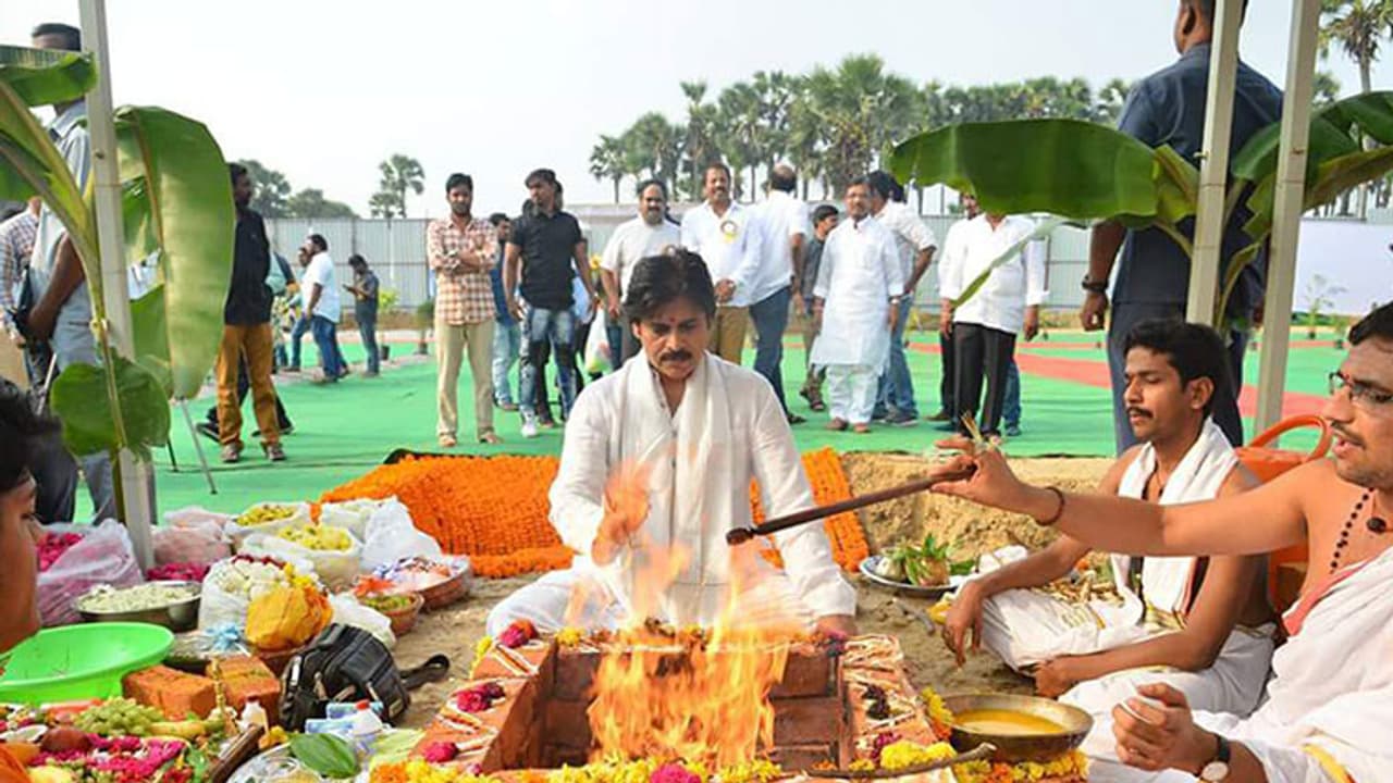 సినిమాలను పూర్తిగా పక్కనబెట్టిన పవర్ స్టార్ పవ న్ కల్యాణ్ అమరావతిలో నూతన గృహనిర్మాణానికి పూజ సతీసమేతంగా హోమం నిర్వహించిన పవర్ స్టార్ జనసేనాని పవన్ కల్యాణ్