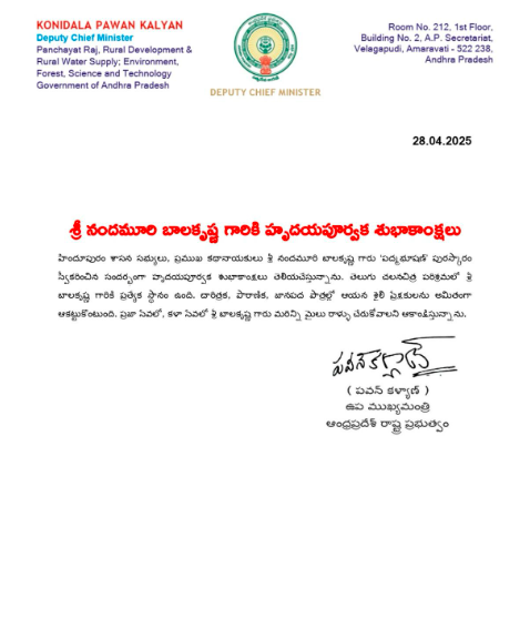 'హిందూపురం శాసన సభ్యులు, ప్రముఖ కథానాయకులు శ్రీ నందమూరి బాలకృష్ణ గారు పద్మ భూషణ్ పురస్కారం స్వీకరించిన సందర్భంగా హృదయపూర్వక శుభాకాంక్షలు తెలియజేస్తున్నాను. తెలుగు చలన చిత్ర పరిశ్రమలో శ్రీ బాలకృష్ణ గారికి ప్రత్యేక స్థానం ఉంది. చారిత్రాత్మక, పౌరాణిక, జానపద పాత్రల్లో ఆయన శైలి ప్రేక్షకులని విపరీతంగా ఆకట్టుకుంది. ప్రజాసేవలో, కళా సేవలో శ్రీ బాలకృష్ణ గారు మరిన్ని మైళ్ళు రాళ్లు చేరుకోవాలని ఆకాంక్షిస్తున్నాను' అంటూ పవన్ కళ్యాణ్ పేర్కొన్నారు.