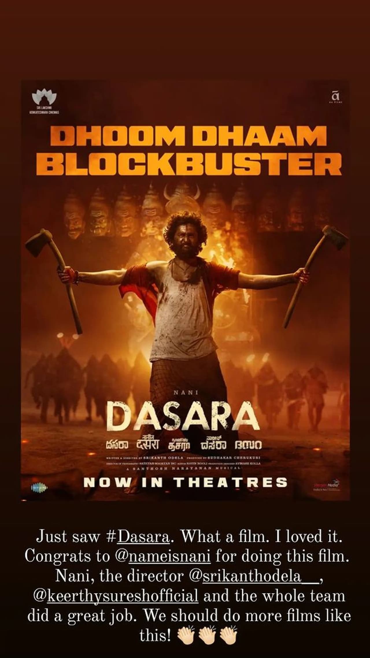 డెబ్యూ దర్శకుడు శ్రీకాంత్ ఓదెల తొలి చిత్రంతోనే కుంభస్థలాన్ని కొట్టాడు అంటూ ప్రశంసలు దక్కుతున్నాయి. ఈ చిత్రంలో నాని సరసన నటించిన కీర్తి సురేష్ నటనకు కూడా ప్రేక్షకుల నుంచి మంచి రెస్పాన్స్ దక్కుతోంది. ఈ చిత్రానికి ప్రేక్షకులతో పాటు స్టార్స్ నుంచి కూడా ప్రశంసలు దక్కుతున్నాయి.