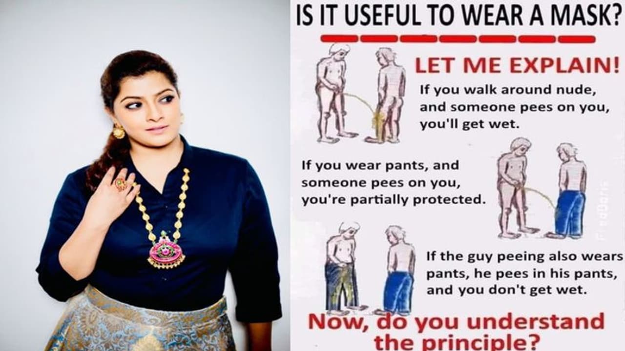 ఒక ఫొటోను షేర్ చేసిన ఆమె మాస్క్ యొక్క ప్రాముఖ్యతను కాస్త బోల్డ్ గా చెప్పింది. ఆ ఫొటోలో ఏముందంటే..ప్యాంట్ ధరించి మూత్రం పోస్తే ప్యాంట్ లో పడుతుంది. ఎదురుగా వ్యక్తి ఉన్నప్పుడు పాయింట్ విప్పి మూత్రం పోస్తే ఆ ప్యాంట్ తడుస్తుంది. అదే ఇద్దరు ప్యాంట్లు లేకుండా ఉంటే ఇద్దరు కూడా తడుస్తారు. అదే ఇద్దరు ప్యాంట్లు ధరిస్తే ఒక్కరికే ప్రమాదం. అందుకే ప్రతి ఒక్కరు మాస్క్ ధరించాలని బోల్డ్ గా వరలక్ష్మి పోస్ట్ చేసింది.