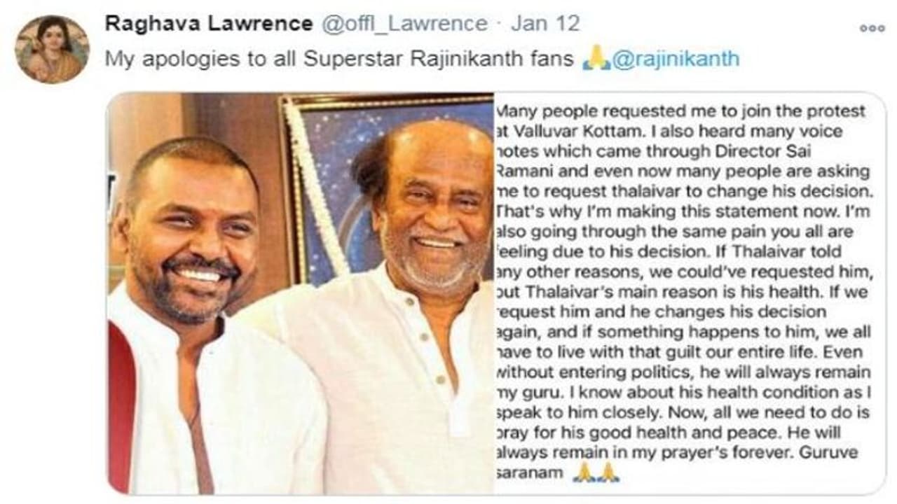 ప్రముఖ కొరియోగ్రాఫర్, దర్శకుడు రాఘవ లారెన్స్ తాజాగా సూపర్స్టార్ రజనీకాంత్ అభిమానులకు క్షమాపణలు ఈ మేరకు ఓ ప్రకటన విడుదల చేసారు. రజనీ ఫ్యాన్స్ ఇప్పుడీ ప్రకటనను సోషల్ మీడియాలో షేర్ చేస్తున్నారు. తమిళ మీడియాలో ఈ విషయం హాట్ టాపిక్ గా మారింది. లారెన్స్ స్పందించటానికి గల కారణం ఏమిటన్నది చర్చనీయాంశంగా మారింది. ఆ వివరాలు ఇక్కడ చూద్దాం