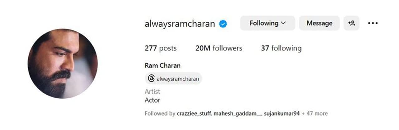 ఇక ఈ 20మిలియన్ మార్క్ ని రామ్ చరణ్ 1635 రోజుల్లో చేరుకున్నారు.కాగా రామ్ చరణ్ కంటే ముందు ఈ మార్క్ని అల్లు అర్జున్, విజయ్ దేవరకొండ అందుకున్నారు. అల్లు అర్జున్ కు ఈ మార్క్ ను అందుకోవడం కోసం 1925 రోజులు పట్టింది. అదే రౌడీహీరో విజయ్ దేవరకొండకి 2050 రోజులు పట్టగా రామ్ చరణ్ వీళ్లిద్దరికంటే ముందు ఈ రికార్డ్ సాధించాడు. కాని సౌత్ లో ఇన్స్టాగ్రామ్ ఎక్కువ ఫాలోవర్స్ ఉన్న హీరోల్లో అల్లు అర్జున్ 24.2M ఫాలోవర్స్ తో మొదటి స్థానంలో ఉంటే, నెక్స్ట్ ప్లేసులో విజయ్ దేవరకొండ 20.7M ఫాలోవర్స్ తో ఉన్నారు.