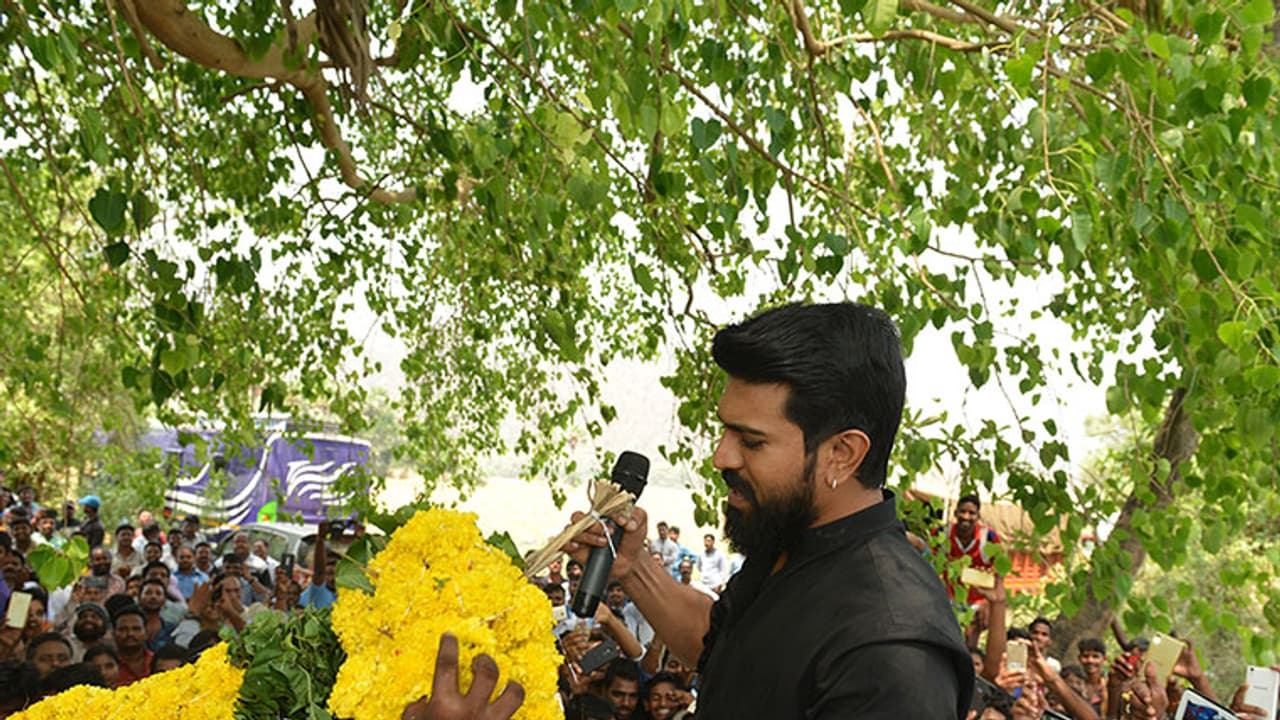 మెగాఫ్యాన్స్ జాతీయ అధ్యక్షుడు రమణం స్వామినాయుడు మాట్లాడుతూ, `-గత 26 రోజులు నుంచి పోలవరం పరిసర ప్రాంతాల్లో, అనగా కొత్తూరు, టేకూరు మరియు గిరిజన ప్రాంతాల్లో ఇప్పటివరకూ ఏ సినిమా షూటింగ్ జరగని ప్రదేశాల్లో ఈ సినిమా షూటింగ్ జరుగుతోంది. హైదరాబాద్ కంటే భారీ ఉష్ణోగ్రతలు నమొదయ్యే ప్రాంతాలలో వేడిమిని తట్టుకుని చిత్ర యూనిట్ షూటింగ్ చే్స్తున్నారు. అదే విధంగా అక్కడ ఉన్న అద్భుతమైన అందాల నడుమ షూటింగ్ చేస్తున్నారు. కథకు సంబంధించిన పురాతనమైన గ్రామాలు దొరకడం వల్ల సుకుమార్ ఆ ప్రాంతాన్ని ఎన్నుకున్నారు. అందుకు హీరో రామ్ చరణ్ ఏ మాత్రం కాదనకుండా ఎంత కష్టమైనా చేద్దామని టీమంతా కలిసి ఇక్కడే షూటింగ్ చేస్తున్నారు. ఈ ప్రాంతాల్లో ఎలాంటి సెల్ ఫోన్లు పనిచేయవు. మధ్యలో రెండు రోజులు కొల్లేరు ప్రాంతంలో షూటింగ్ జరిపారు. ఈ ప్రాంతంలో షూటింగ్ సమయంలో భారీగా వీరాభిమానులు తరలి రావడం వల్ల వాళ్ల ధాటికి తట్టుకోలేక షూటింగ్ క్యాన్సిల్ చేశారు. తర్వాత కొత్తూరు లో నిన్నటి రోజున (ఆదివారం 23వ తేదీన) మధ్యాహ్నం 12 గంటల సమయంలో కూడా అభిమానుల తాకిడి ఎక్కువ కావడంతో షూటింగ్ రద్దు చేశారు. రోజు రోజుకి మారుమూల గ్రామాల నుంచి అభిమానులు భారీ ఎత్తున తరలి వస్తున్నారు. షూటింగ్ చూడటానికి వచ్చిన ఓ అభిమాని కుటుంబం తమ బాబుకి కిడ్నీ సంబంధింత వ్యాదితో బాధ పడుతుంటే, ఎన్ని ఆసుపత్రులు తిరిగినా సరైన వైద్యం కుదరకపోవడంతో స్వయంగా హీరో చరణ్ వైద్య సదుపాయాలు కల్పించారు. అలాగే షూటింగ్ చూడటానికి వచ్చిన అభిమానులందరికీ ఆయన భోజన వసతులు కల్పించారు. వారం రోజుల క్రితం ఏపీ, తెలంగాణ రాష్ర్టాలకు కొత్త అధ్యక్షులను కె. నాగేంద్రబాబు నియమించారు. ఏపీ అధ్యక్షుడిగా కె. రామకృష్ణ (తణుకు), తెలంగాణ రాష్ర్ట అధ్యక్షుడిగా ఏ.నందకిషోర్ (సూర్యాపేట) ఎంపికయ్యారు. వారిద్దర్నీ అశేష అభిమానుల సమక్షంలో చరణ్ ప్రతిపాదించి అభినందించారు` అని తెలిపారు.