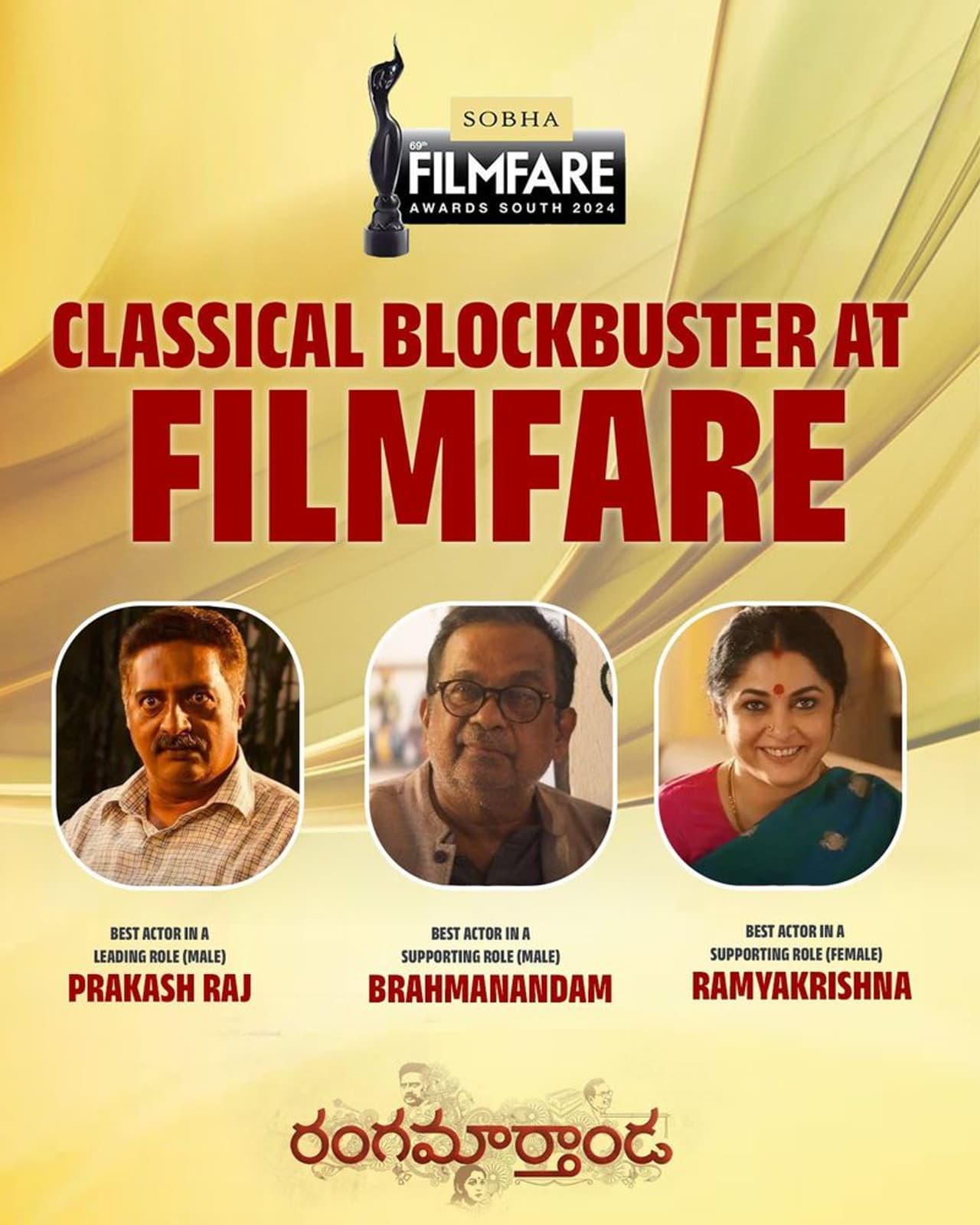 ఏకంగా మూడు విభాగాల్లో రంగమార్తాండ చిత్రానికి ఫిలిం ఫేర్ అవార్డులు దక్కాయి. బెస్ట్ యాక్టర్ లీడింగ్ రోల్ విభాగంలో ప్రకాష్ రాజ్ కి, బెస్ట్ యాక్టర్ సపోర్టింగ్ రోల్ (మేల్) విభాగంలో బ్రహ్మానందం కి.. బెస్ట్ యాక్టర్ సపోర్టింగ్ రోల్ ( ఫిమేల్) విభాగంలో రమ్యకృష్ణ కి అవార్డులు దక్కాయి.