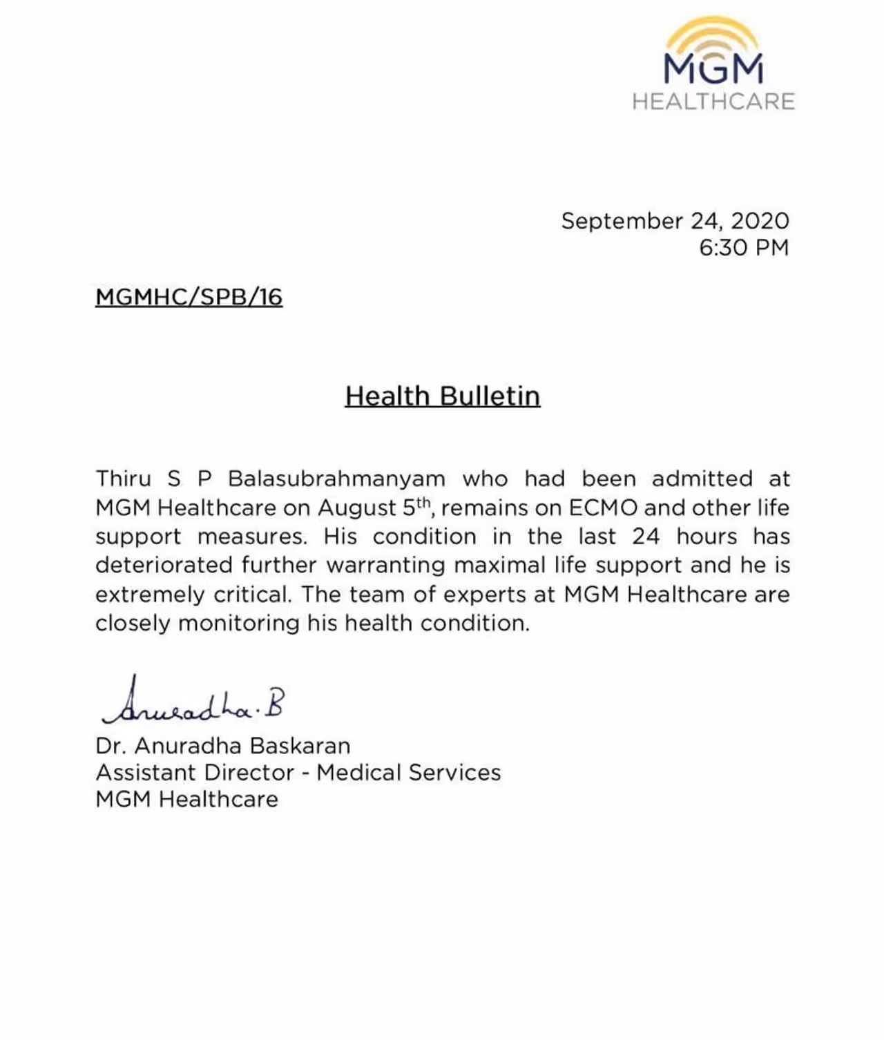 ప్రస్తుతం ఆయన ఆరోగ్యం అత్యంత విషమంగా వుందని వెల్లడించారు. వైద్య నిపుణుల బృందం ఆయన ఆరోగ్యాన్ని నిరంతరం పర్యవేక్షిస్తోందని బులెటిన్లో ప్రస్తావించారు. గత 24 గంటల్లో ఎస్పీ ఆరోగ్యం తీవ్రంగా క్షీణించిందని ఎంజీఎం వర్గాలు తెలిపాయి.