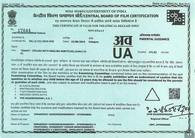 ఫైనల్ గా సాహో సెన్సార్ పనులను ముగించుకుంది. రిలీజ్ డేట్ దగ్గరపడుతుండంతో యూవీ క్రియేషన్స్ గత కొన్ని రోజుల నుంచి వీలైనంత త్వరగా సాహో సెన్సార్ పనులను ఫినిష్ చేయాలనీ శ్రమిస్తోంది. ఎట్టకేలకు సెన్సార్ నుంచి పాజిటివ్ టాక్ తో U/A సర్టిఫికెట్ ను అందుకుంది.