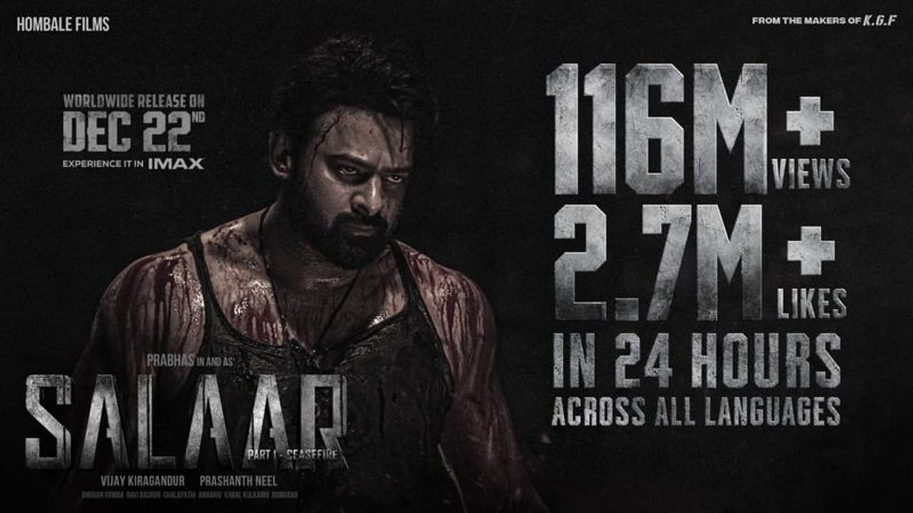 డిసెంబర్ 1న సాయంత్రం 7:19 నిమిషాలకు సలార్ ట్రైలర్ విడుదలైంది. నేటి సాయంత్రంతో ఒక రోజు పూర్తి చేసుకుంది. విడుదలైన గంటలోనే 50 మిలియన్ల వ్యూస్ ను దక్కించుకొని సెన్సేషన్ గా మారింది. ఇవ్వాళ్టితో 24 గంటలు గడిచింది. ఈ సందర్భంగా ట్రైలర్ కు వచ్చిన రెస్పాన్స్ ను మేకర్స్ వెల్లడించారు. యూట్యూబ్ లో అన్నీ భాషల్లో విడుదలైన సలార్ ట్రైలర్ రికార్డు బ్రేకింగ్ వ్యూస్, లైక్స్ ను దక్కించుకుంది. ఒకరోజులో 116 మిలియన్ల వ్యూస్ ను, 2.7 మిలియన్ల లైక్స్ ను సొంతం చేసుకుంది.