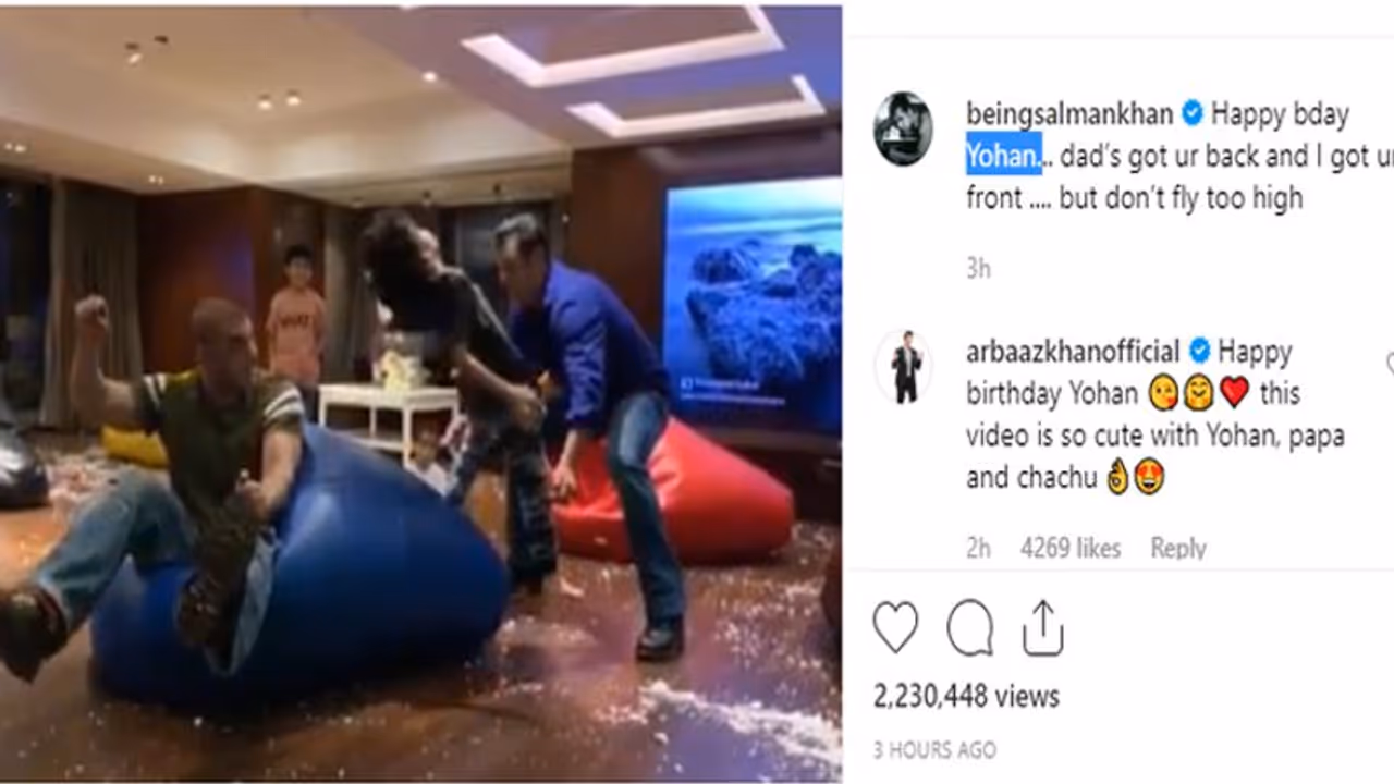 తన సోదరుడి కొడుకైన యోహాన్ తో కలిసి విచ్చల విడిగా ఎంజాయ్ చేసినట్లు తెలుస్తోంది. యోహాన్ పుట్టినరోజు కావడంతో స్పెషల్ గా పార్టీ ఇచ్చిన సల్మాన్ కాసేపు వారితో ఆడుకున్నాడు. బీన్ బ్యాగ్ పై కూర్చున్న యోహాన్ ని వెనకనుంచి అర్బాజ్ ఖాన్ గాల్లోకి లేపితే ముందు నుంచి సల్మాన్ జాగ్రత్తగా పట్టుకున్నాడు.