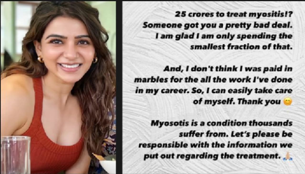 ఇందులో సమంత చెబుతూ, `మయోసైటిలస్ వ్యాధి చికిత్సకి రూ.25కోట్లా? ఎవరో మీతో డీల్ కుదుర్చుకున్నారు(తప్పుడు సమాచారం ఇచ్చారు). అందులో నేను చాలా తక్కువ మాత్రమే ఖర్చు చేస్తున్నందుకు సంతోషిస్తున్నా. నేను చేసిన పని కారణంగా నాకు ఎంతో కొంత ఉంది. నన్ను నేను జాగ్రత్తగా చూసుకోగలను. మయోసైటిస్ వ్యాధి ఇప్పుడు వేలాడి మంది ఎదుర్కొంటున్న సమస్య. చికిత్సకి సంబంధించిన మేం అందించే సమాచారం విషయంలో జాగ్రత్తగా ఉండండి` అని పేర్కొంది సమంత.