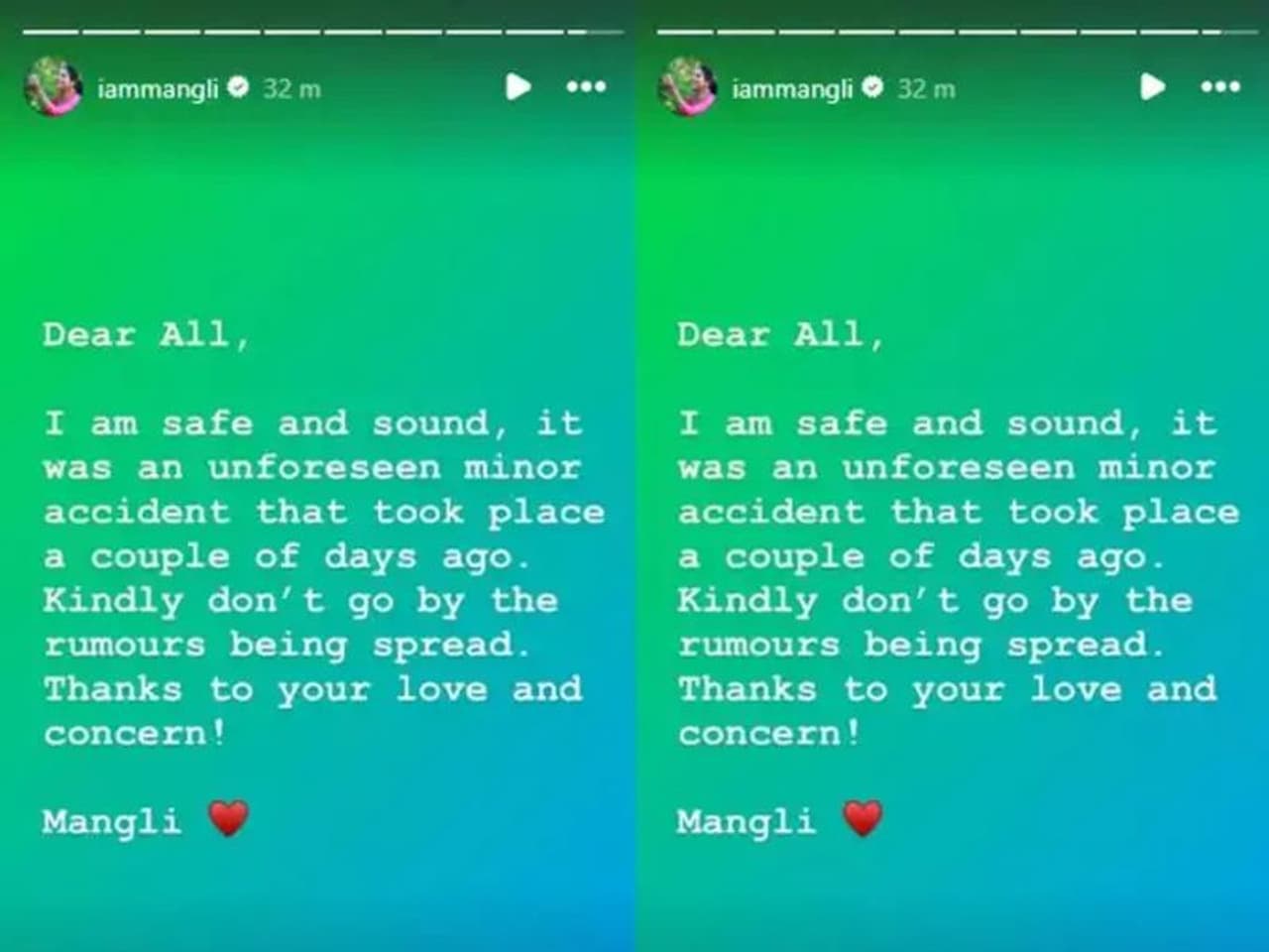 ''డియర్ ఆల్... నేను క్షేమంగా ఉన్నాను. నాకు ఏం కాలేదు. ఇటీవల అనుకోకుండా చిన్న ప్రమాదం జరిగింది. ప్రచారం అవుతున్న పుకార్లను నమ్మవద్దు. మీ ప్రేమాభిమానాలకు ధన్యవాదాలు... ఇట్లు మీ మంగ్లీ'' సోషల్ మీడియాలో కామెంట్ పోస్ట్ చేశారు. ప్రచారం అవుతున్నట్లు తనకేమీ కాలేదని. అది చిన్న ప్రమాదం అని మంగ్లీ స్పష్టత ఇచ్చారు. పుకార్లు నమ్మి అభిమానులు ఆందోళన చెందకండని ఆమె పరోక్షంగా వెల్లడించారు.