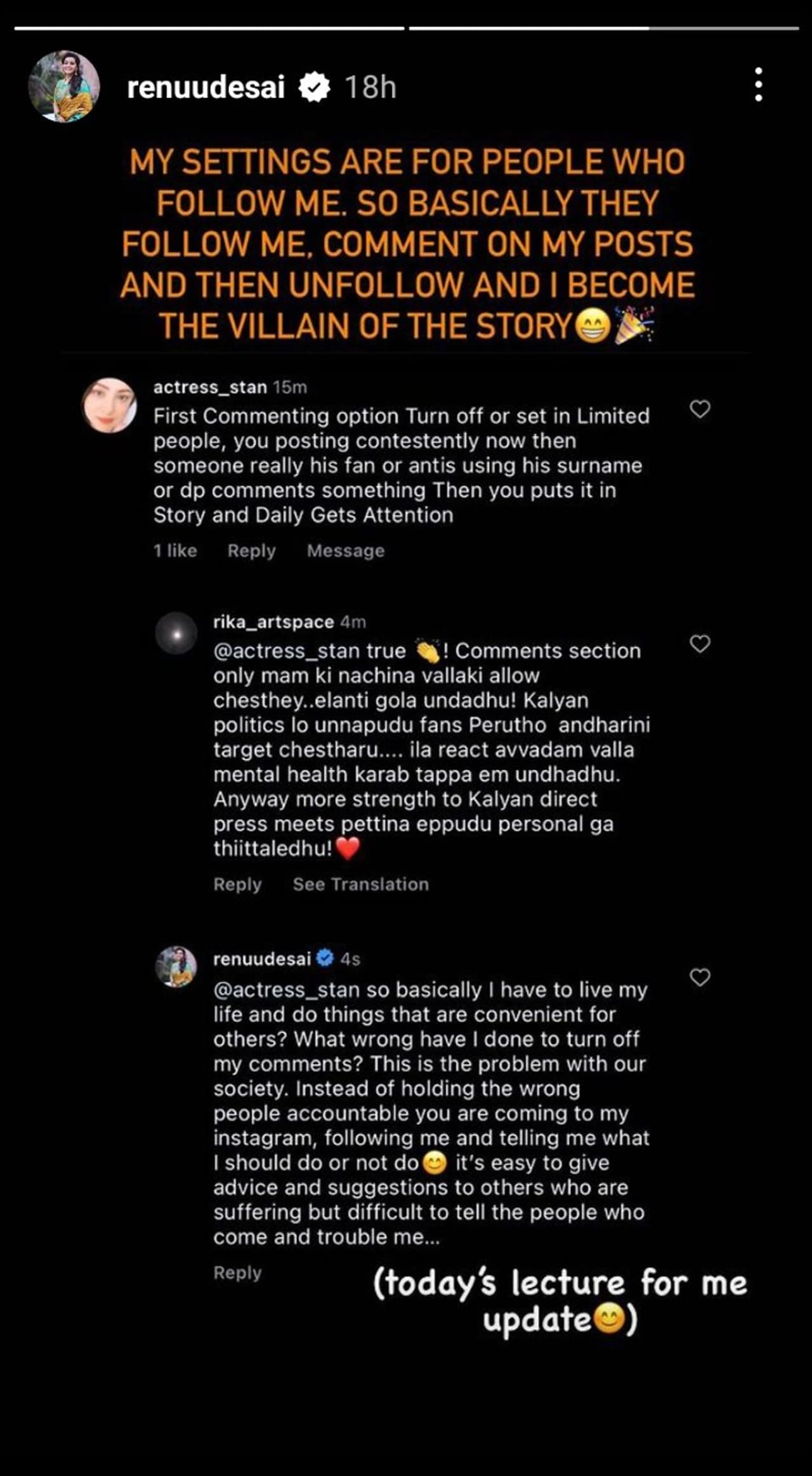 పవన్ అభిమానులను సలహాలను రేణు దేశాయ్ తప్పుబట్టారు. సమాజంతో ఇదే ప్రాబ్లమ్. ఎవరి కోసమో నేను మారాలా? మీరు చెప్పినట్లు జీవించడానికి నేను ఏమి తప్పు చేశాను సలహా ఇవ్వడం చాలా ఈజీ. బాధ అనుభవించే వాళ్లకు తెలుస్తుంది.. అని కామెంట్ చేశారు. తన ఇంస్టాగ్రామ్ స్టేటస్ లో పోస్ట్ చేసిన సంభాషణ వైరల్ అవుతుంది.