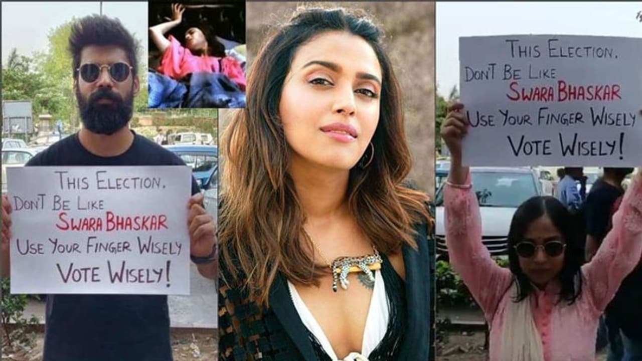 ఈ క్రమంలో కొందరు వ్యక్తులు వినూత్నంగా ప్రచారం చేయాలని భావించి ''ఈ ఎన్నికల్లో స్వర భాస్కర్ లాగా ఉండొద్దు. మీ వేలిని తెలివిగా ఉపయోగించండి'' అంటూ ప్లకార్డులు పట్టుకొని అడల్ట్ ఓటర్లకు అవగాహన కల్పించారు.