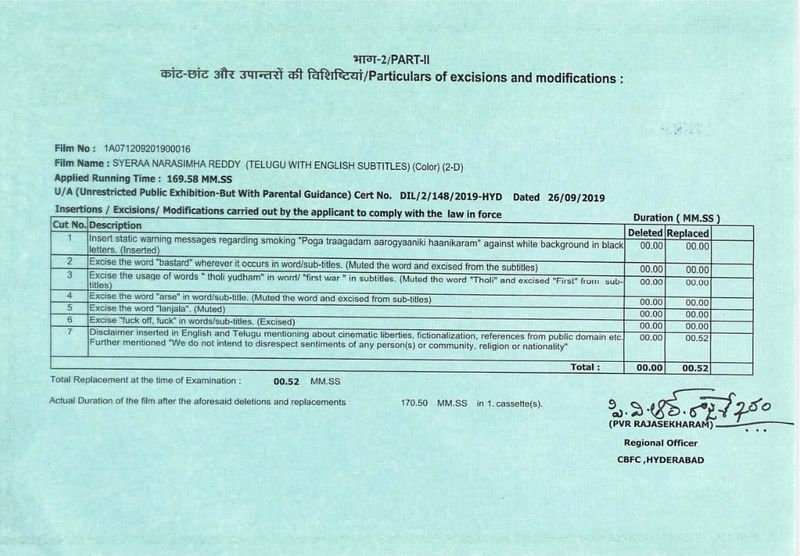 కానీ చిత్రంలో వచ్చే కొన్ని పరుషపదజాలాలని మాత్రం మ్యూట్ చేశారు. మొత్తంగా జీరో కట్స్ తో సైరా చిత్రం రిలీజ్ కు సిద్ధం అవుతోంది. వాస్తవానికి సినిమా నిడివి 169 నిమిషాలు. హెచ్చరిక, ఇతర ప్రకటనలతో కలుపుకుంటే 170 నిమిషాలకు పైగా నిడివి ఉంటుంది.