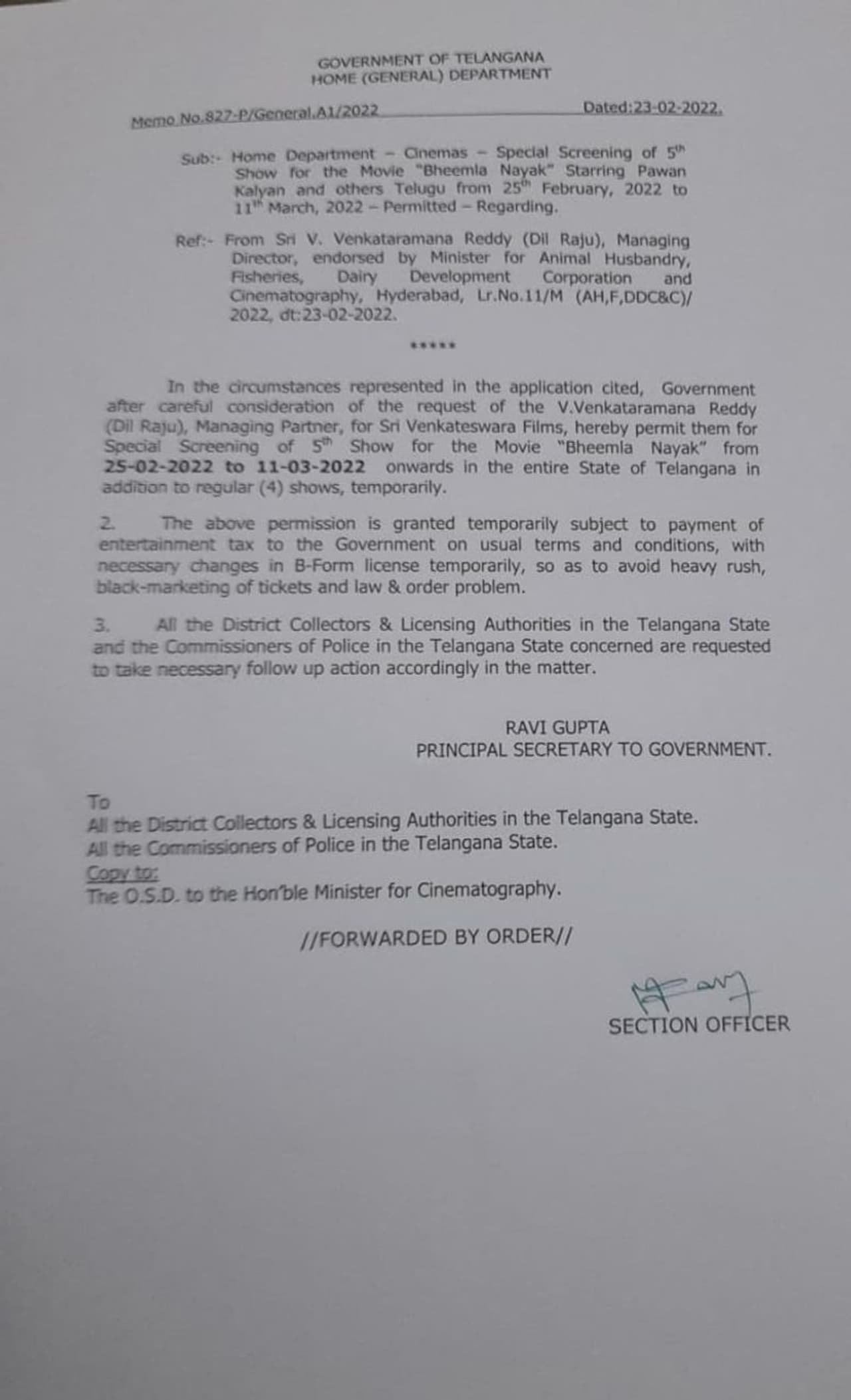ఫిబ్రవరి 25న భీమ్లా నాయక్ గ్రాండ్ రిలీజ్ కి ఏర్పాట్లు జరుగుతున్నాయి. నేడు హైదరాబాద్ లో ప్రీ రిలీజ్ ఈవెంట్ కూడా జరగనుంది. ఇటువంటి తరుణంలో భీమ్లా నాయక్ చిత్రానికి తెలంగాణ ప్రభుత్వం శుభవార్త వినిపించింది. తెలంగాణలో ఈ చిత్ర ఐదవ షోకి అనుమతి ఇస్తూ ఆదేశాలు జారీ చేసింది.