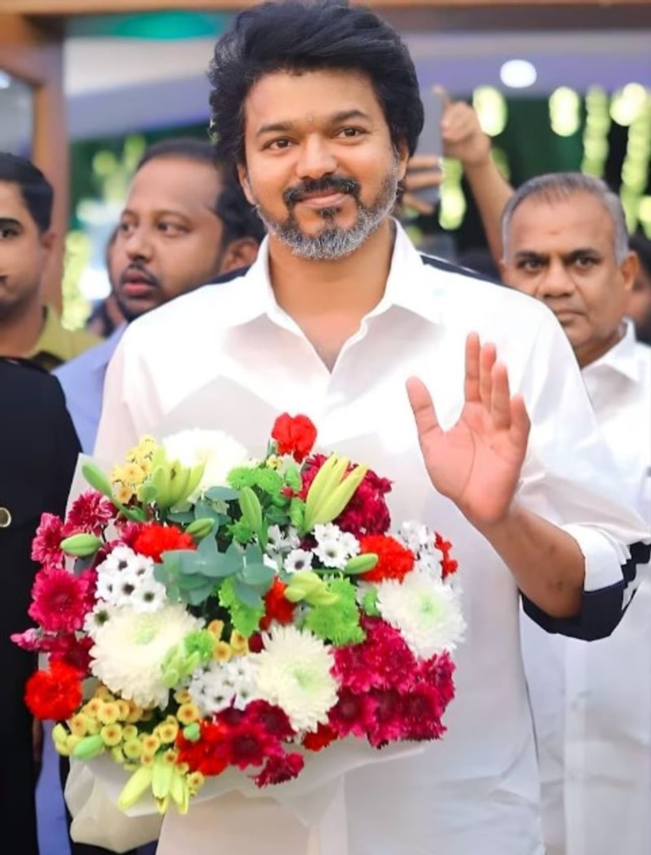 రిసెప్షన్ వేడుకకు విజయ్ చాలా సింపుల్ గా వైట్ షర్ట్ లో మెరిశారు. విజయ్ రాకతో రిసెప్షన్ వేడుక జరుగుతున్న వేదిక చాలా కోలాహలంగా మారింది. వధూవరులకు విజయ్ ఫ్లవర్ బొకే అందించి శుభాకాంక్షలు తెలిపారు. విజయ్ వస్తున్నప్పుడు అభిమానులు కేరింతలు కొడుతున్న దృశ్యాలు సోషల్ మీడియాలో వైరల్ ఆ మారాయి.