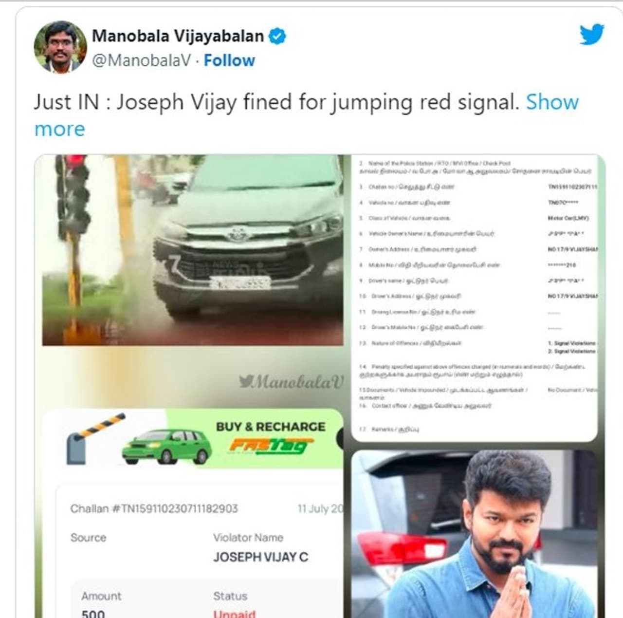 దీనితో విజయ్ ఫ్యాన్స్ నుంచి తప్పించుకునేందుకు రెండు చోట్ల రెడ్ సిగ్నల్ జంప్ చేసినట్లు తెలుస్తోంది. ట్రాఫిక్ రూల్స్ అతిక్రమించినందుకు గాను పోలీసులు విజయ్ కి రూ 500 జరిమానా విధించారు. ఇప్పుడు ఇది సోషల్ మీడియాలో వైరల్ గా మారుతోంది. విజయ్ ఆఫీస్ పనాయుర్ లో ఉండగా ఇల్లు నీలాంగరైలో ఉంది.