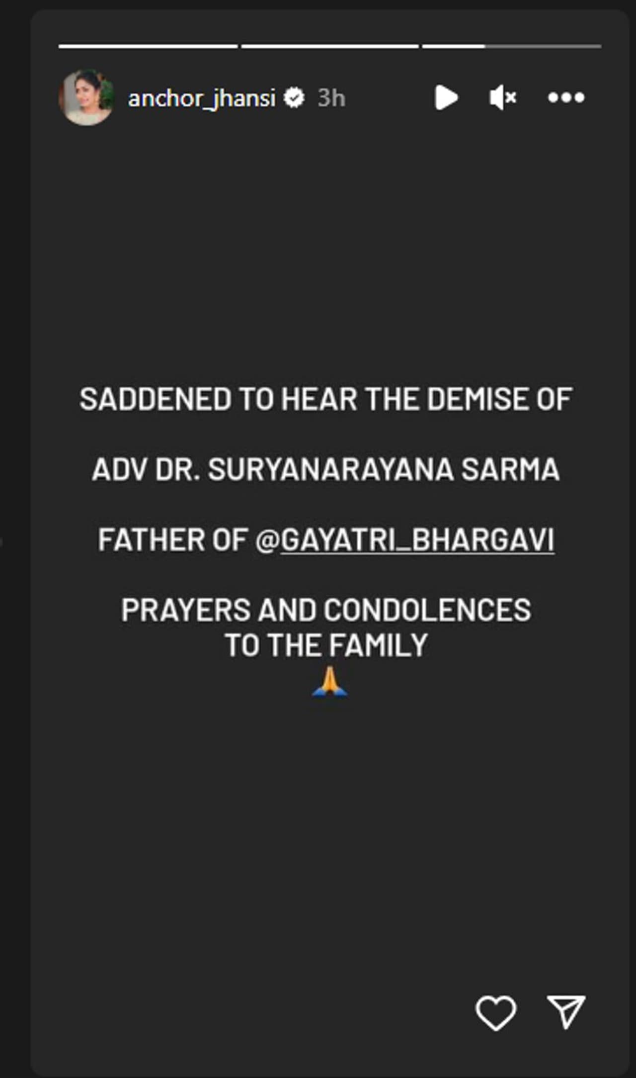 గాయత్రీ భార్గవి ఇంట్లో జరిగిన విషాదం గురించి మరో యాంకర్, నటి ఝాన్సీ మీడియాలో ఎమోషనల్ పోస్ట్ చేసింది. గాయత్రీ భార్గవి తండ్రి సూర్య నారాయణ శర్మ గారు మరణించారని తెలిసి చాలా బాధపడ్డాను. ఈ సమయంలో భగవంతుడు ఆ కుటుంబానికి మనో ధైర్యాన్ని ఇవ్వాలి అంటూ పోస్ట్ చేసింది.