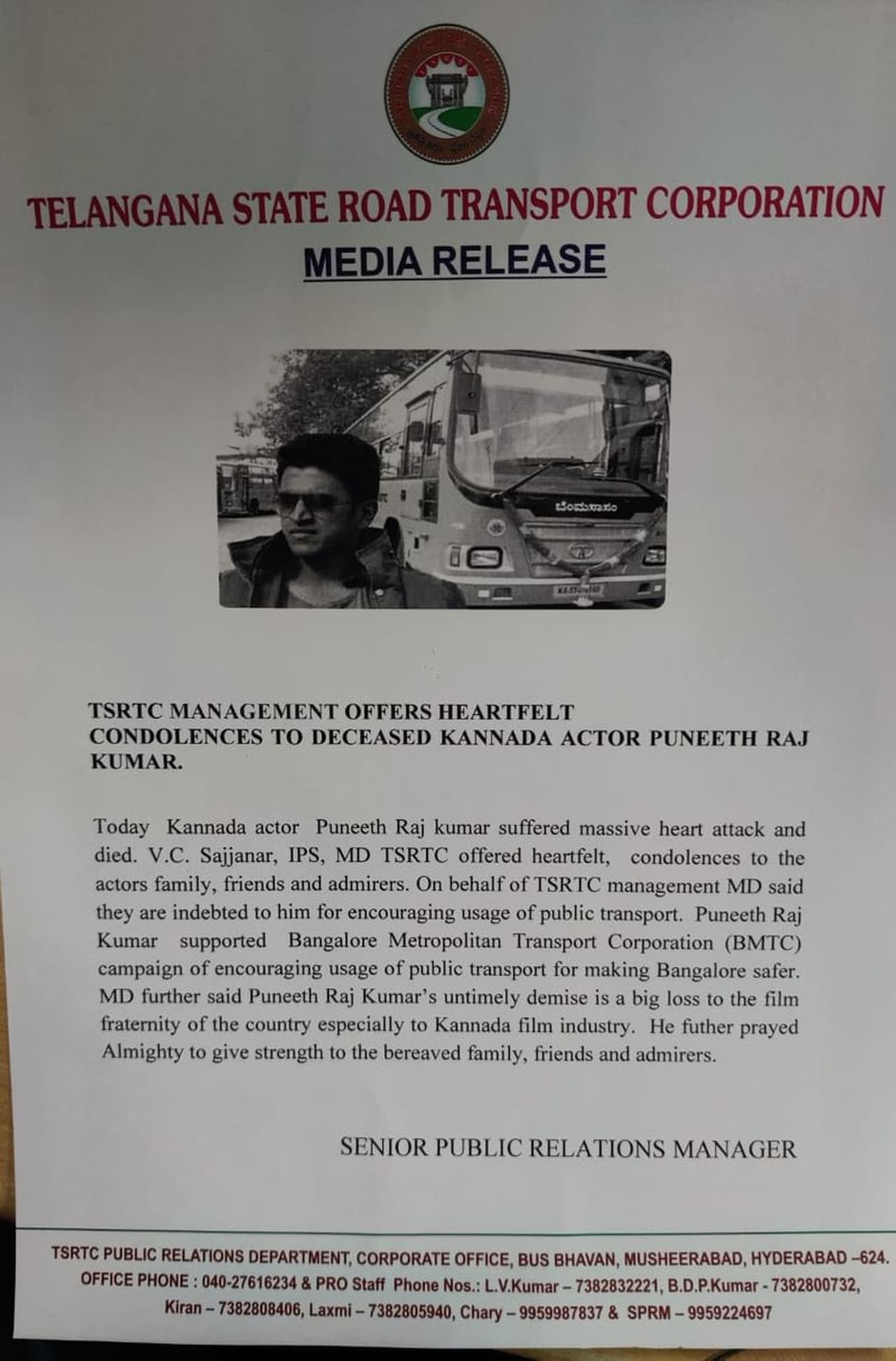 2019లో పునీత్ రాజ్ కుమార్ బీఎంటీసీకి బ్రాండ్ అంబాసిడర్ గా నియమించబడ్డారు. ఈ సేవలని సజ్జనార్ గుర్తు చేసుకుంటూ.. పబ్లిక్ ట్రాన్స్ పోర్ట్ ని ఎంకరేజ్ చేసినందుకు గాను పునీత్ ని అభించారు. తాజాగా ఆయన మృతిపట్ల తీవ్ర విచారం వ్యక్తం చేసిన సజ్జనార్.. పునీత్ కుటుంబ సభ్యులకు ప్రగాఢ సానుభూతి తెలియజేశారు. తెలంగాణ ఆర్టీసీ తరుపున పునీత్ మృతికి సంతాపం తెలియజేస్తూ ప్రెస్ నోట్ కూడా విడుదల చేశారు.